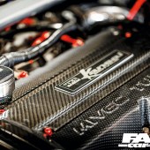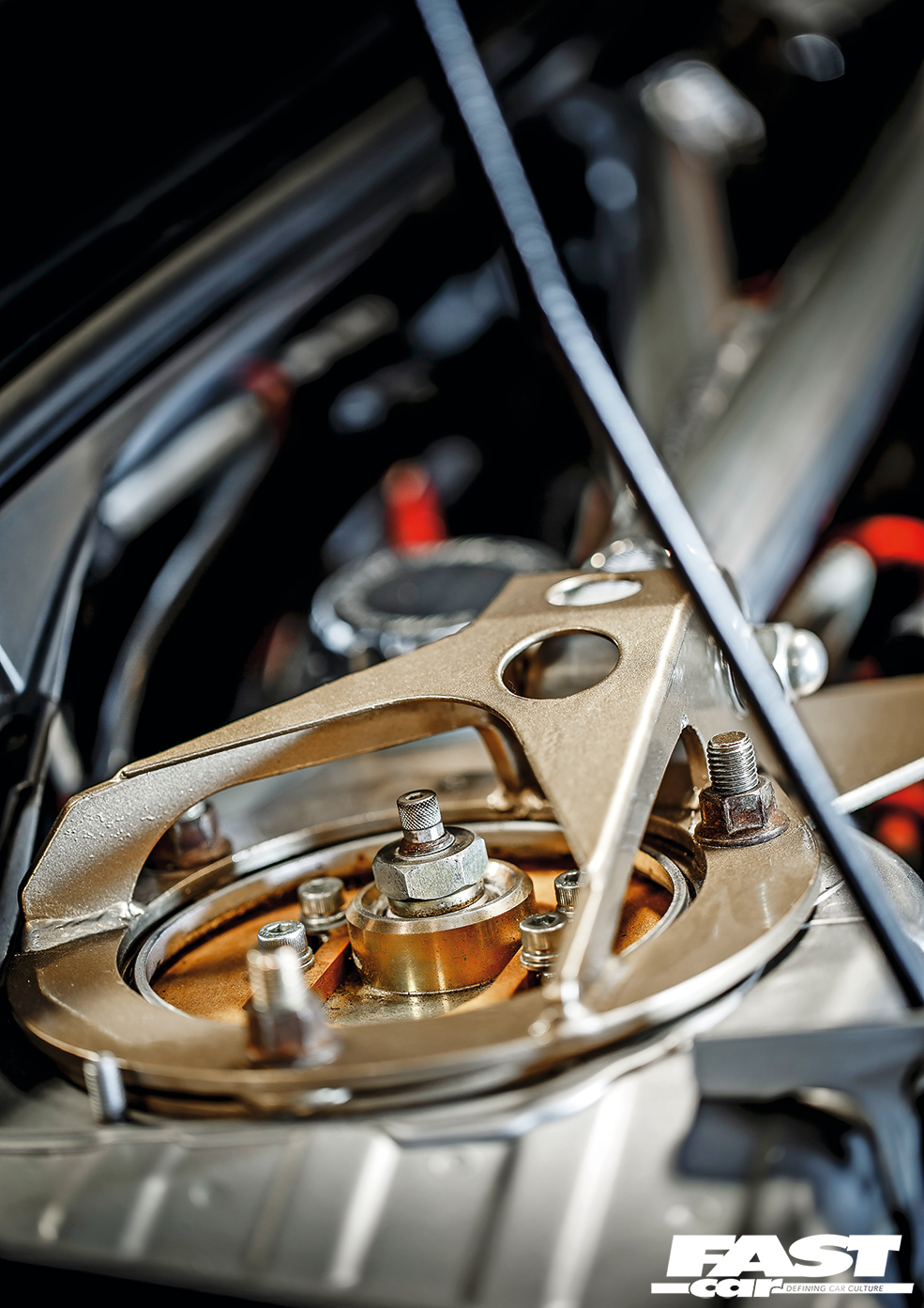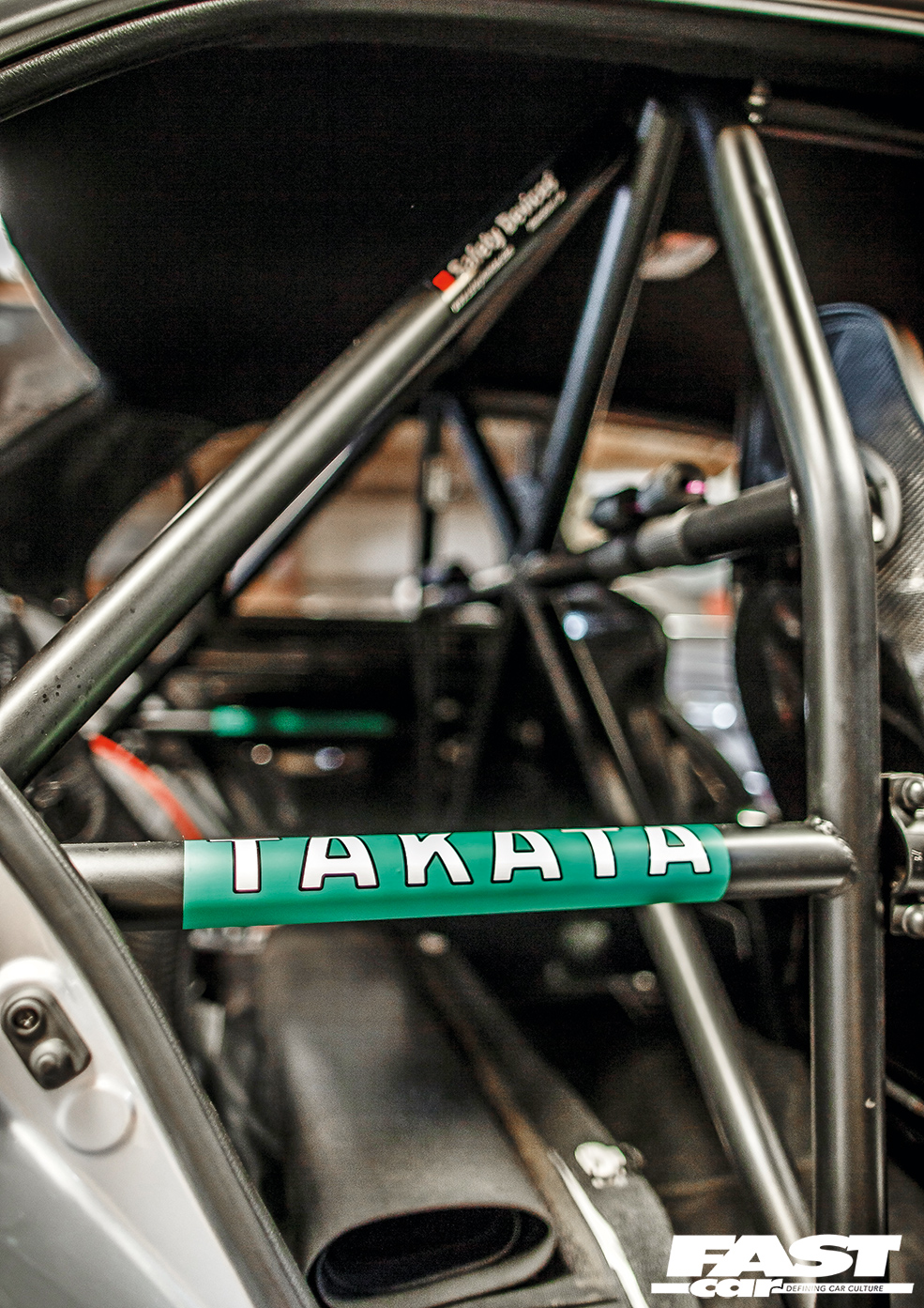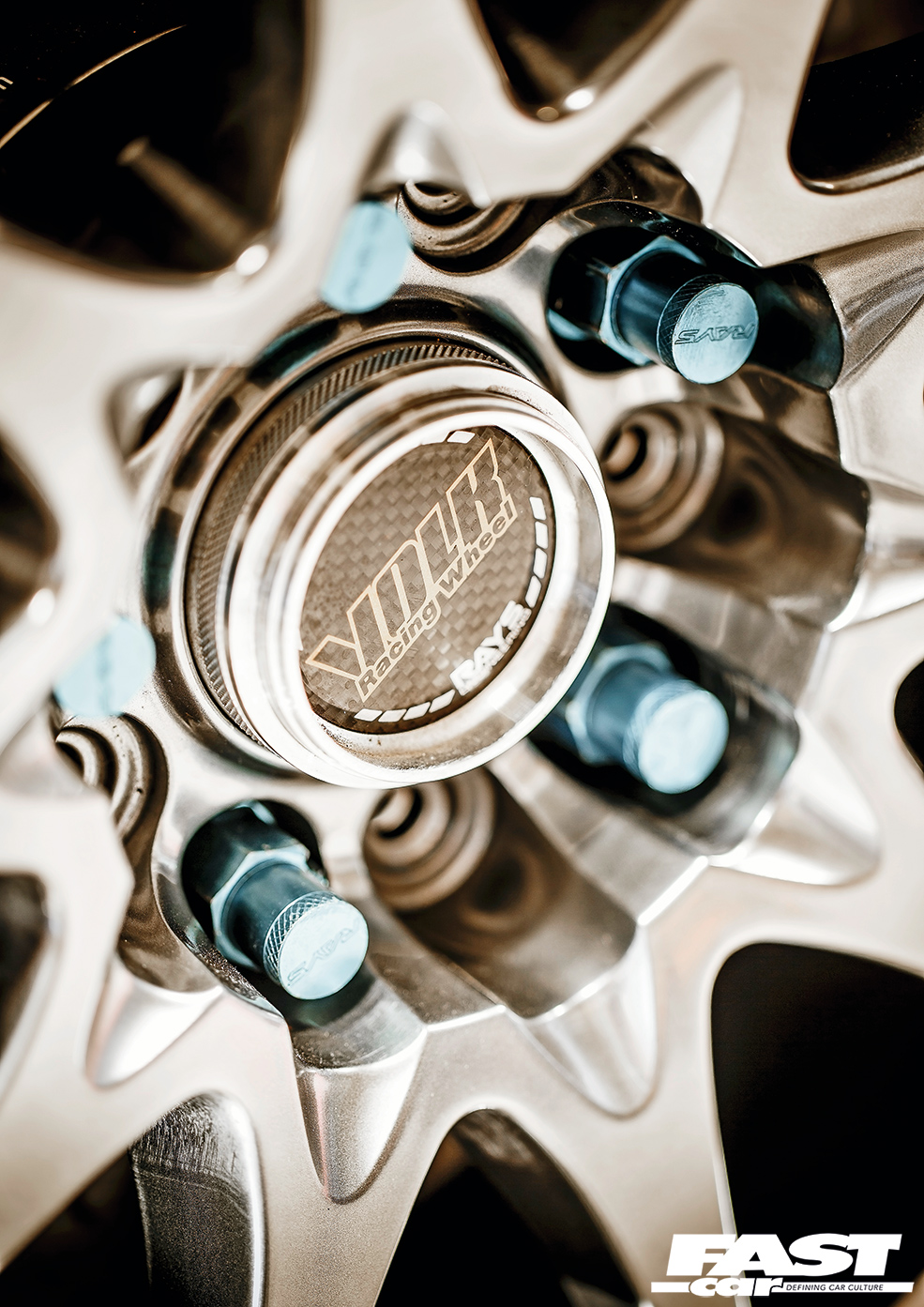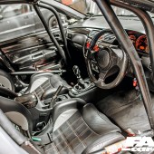 Not only has every removable exterior and interior panel been replaced by perfectly fitted carbon fibre items, but every nut and bolt is brand new. It’s also running countless rare and expensive parts, such as the one-off Volk Racing CE28 wheels that cost as much as a decent Evo IX would, the awesome interior with full Safety Devices roll cage, and custom Cobra Misano carbon seats. There are even custom made billet rear camber arms, allowing Jon to run as wide and low as possible; giving it those show-winning, looks.