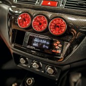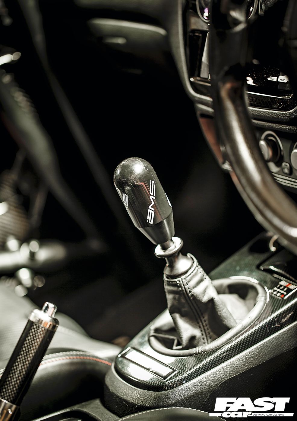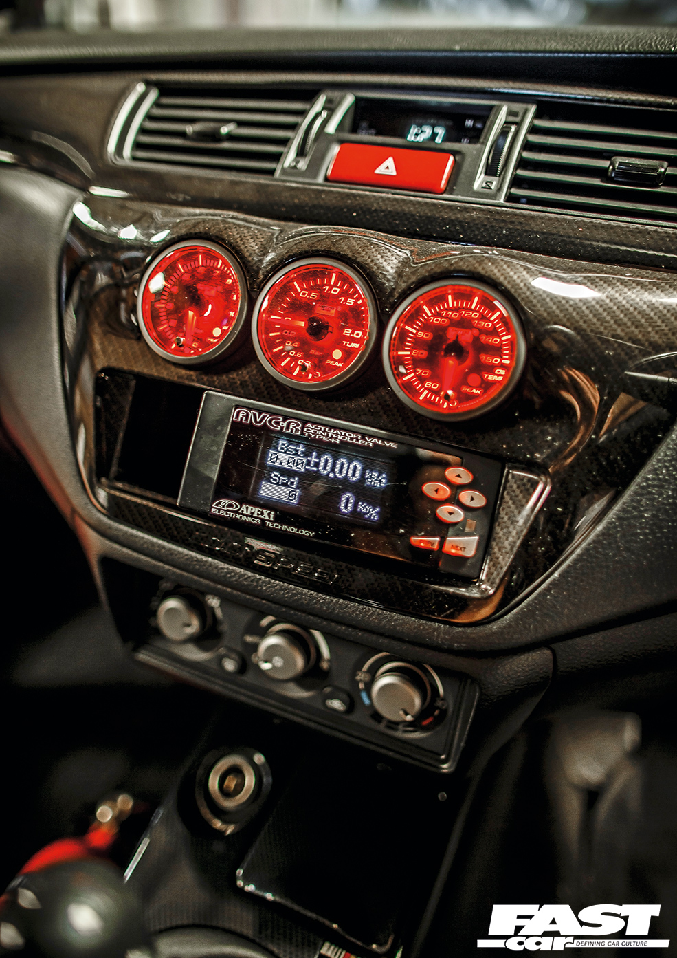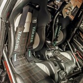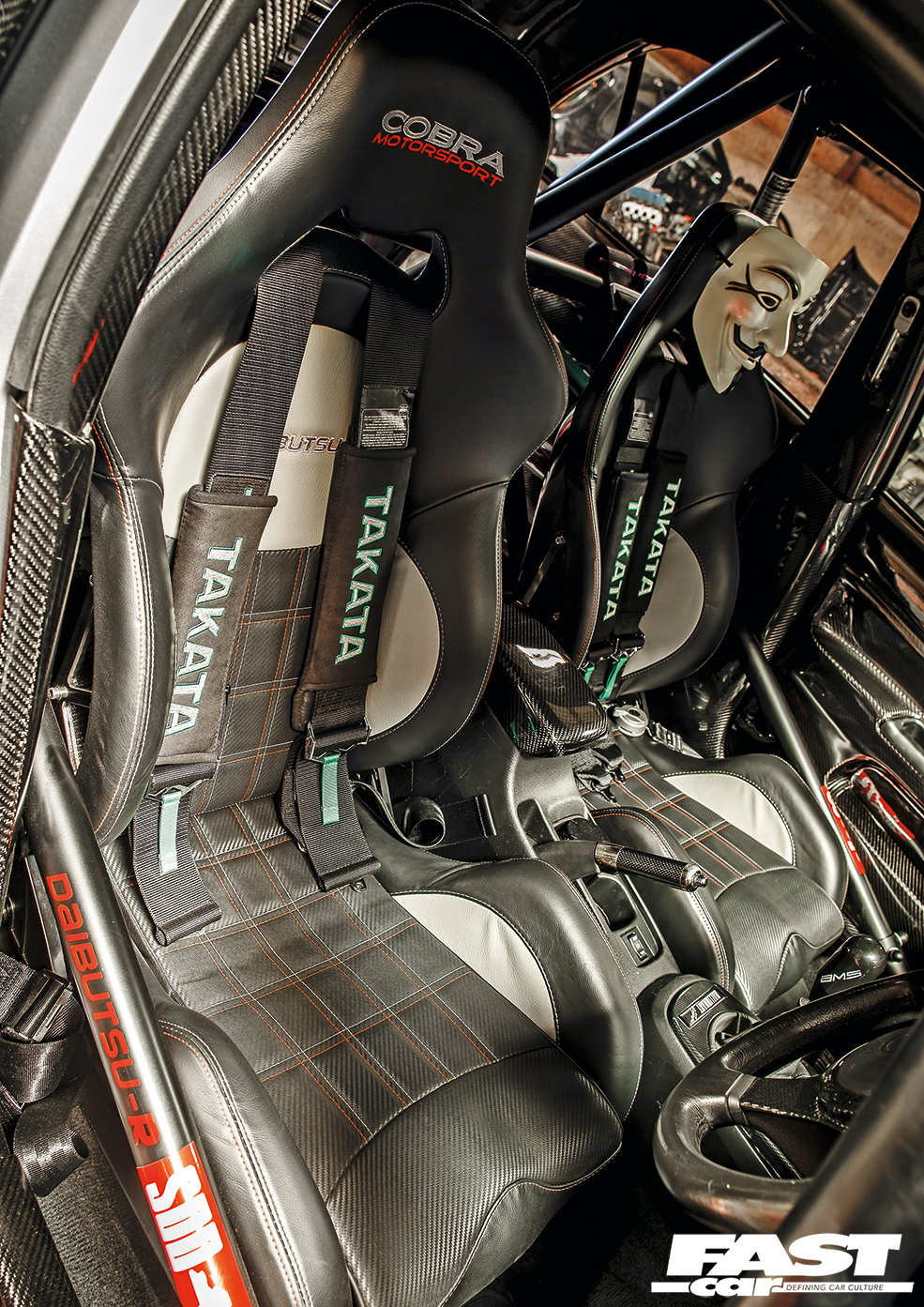 Daibutsu-R Dry carbon interior parts with single coat lacquer, including the front and rear door cars, A,B,C, and D pillars, front and rear kick plates, and parcel shelf, Rexpeed carbon steering wheel, Rexpeed carbon speedo surround, Rexpeed carbon arm rest cover, Ralliart pedals, Ralliart carbon gear surround, Ralliart window switches, custom roof lining, AMS gear knob, Coltspeed carbon gauge and stereo pod, full Safety Devices RBU037 6-point roll cage, Takata 4-point harnesses, Cobra Misano Anniversary Edition carbon seats with carbon leather