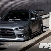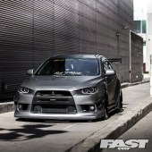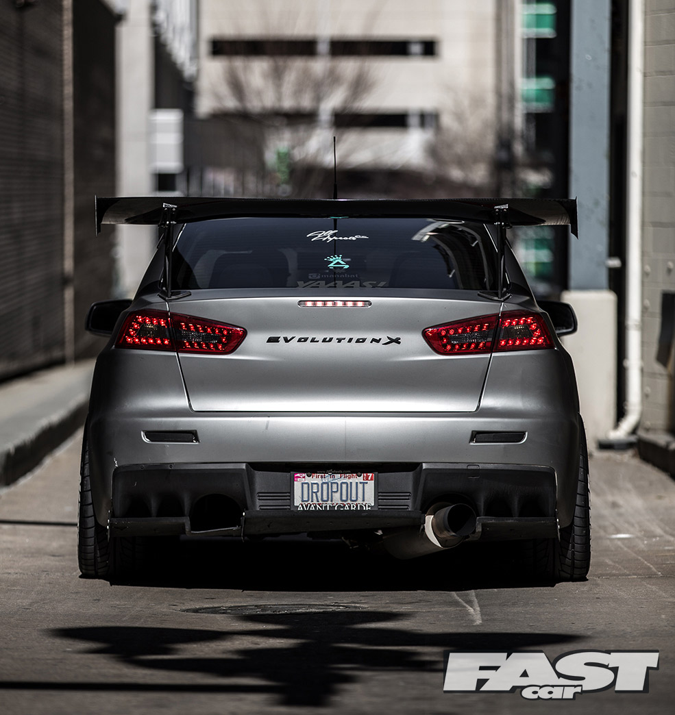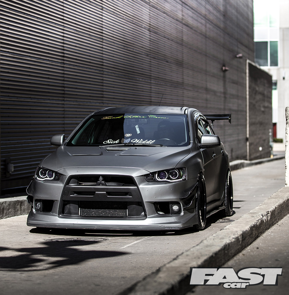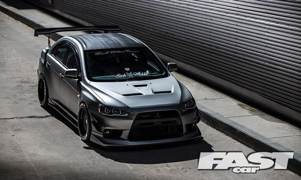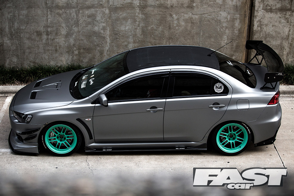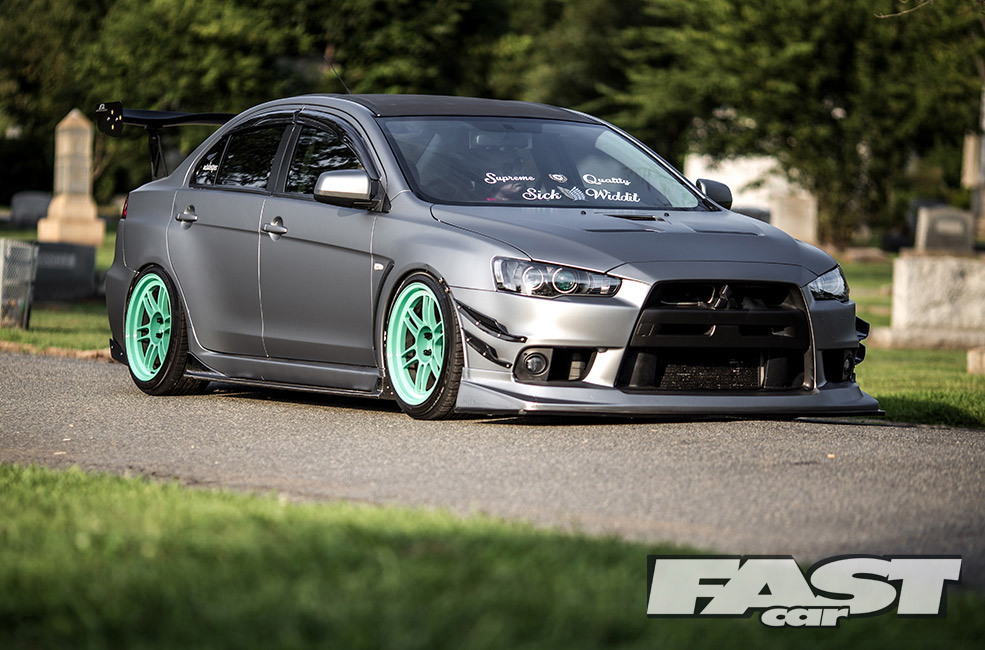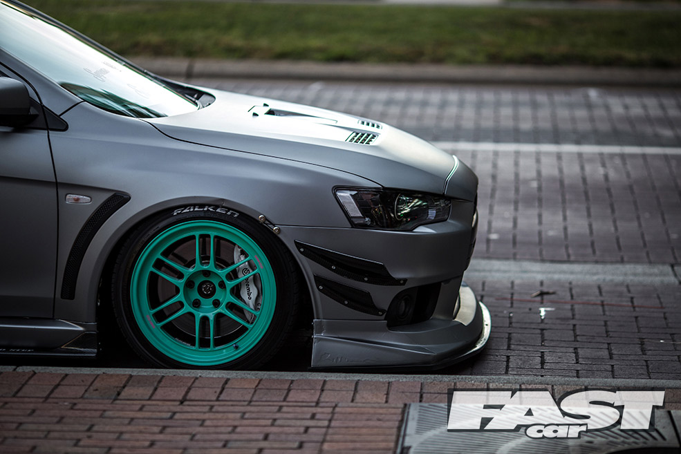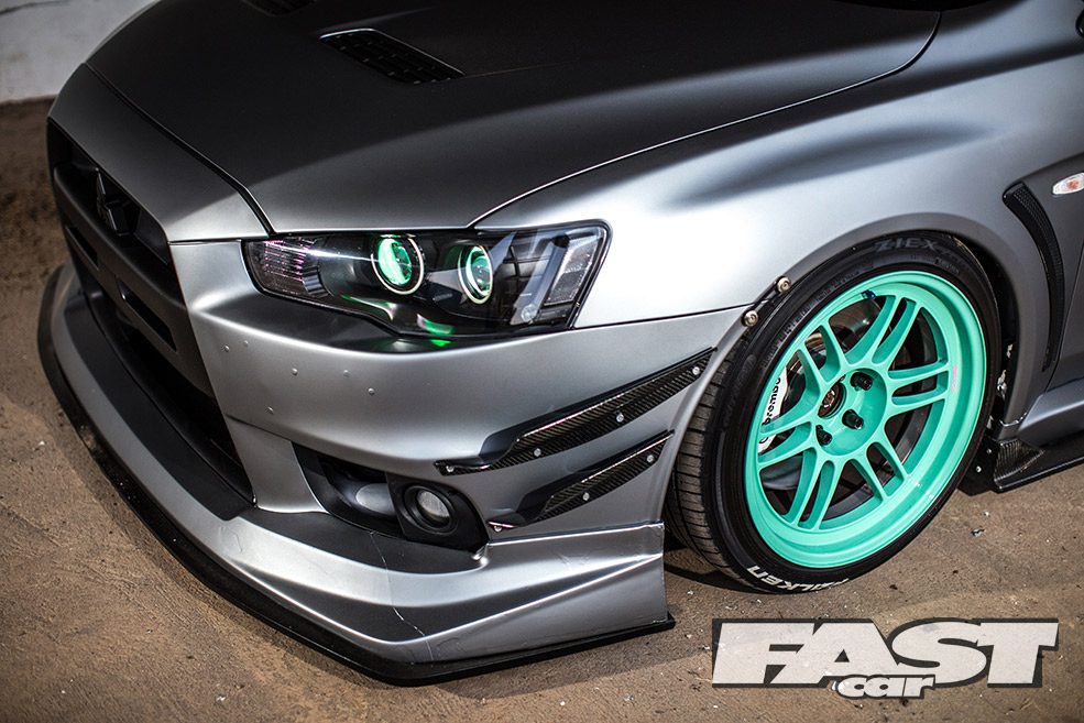 Mitsubishi Evo X with Frozen Grey vinyl wrap; custom rear wing; custom quad projector/halo headlights; Rexpeed diffuser and carbon fibre canards; AIT Racing carbon fibre sideskirts; replica Voltrex splitter.
