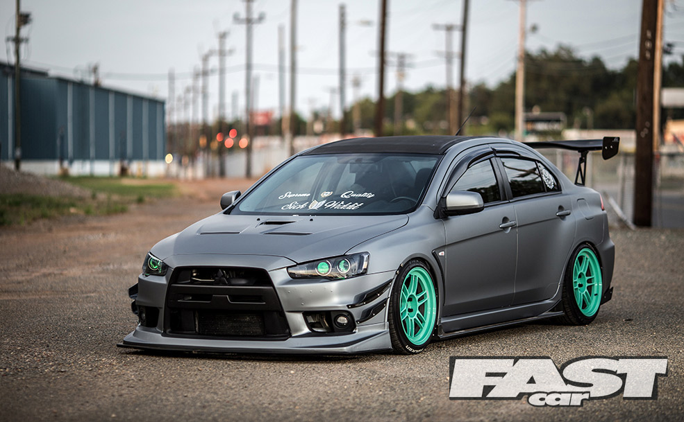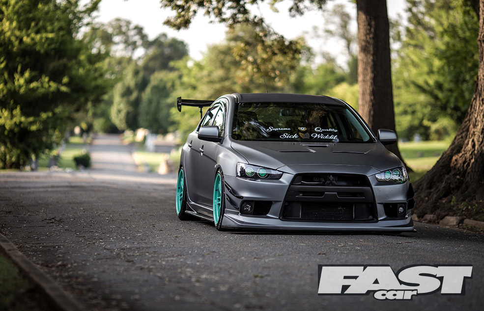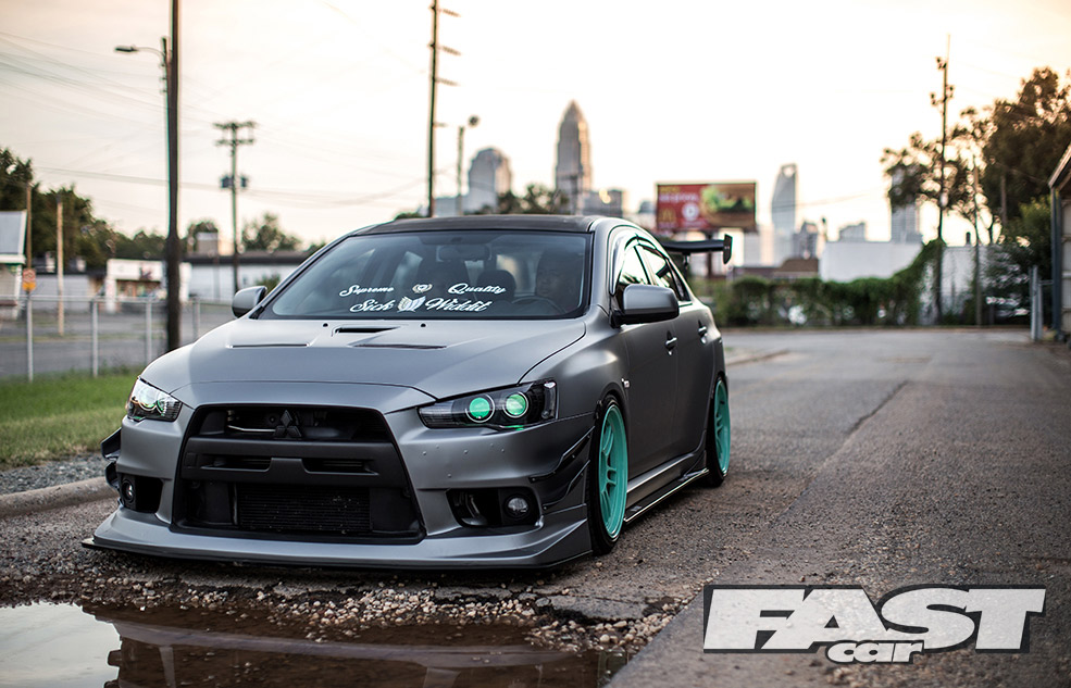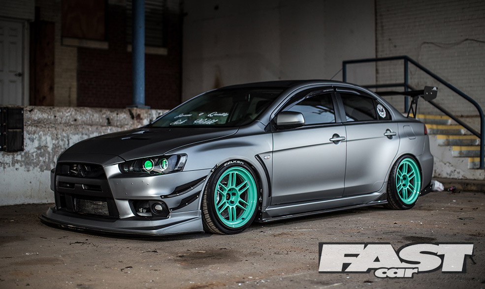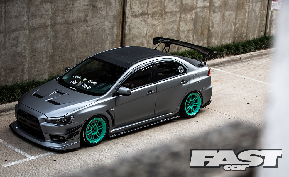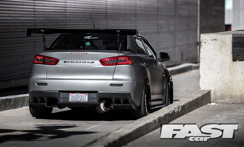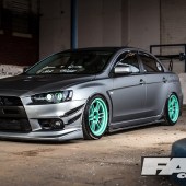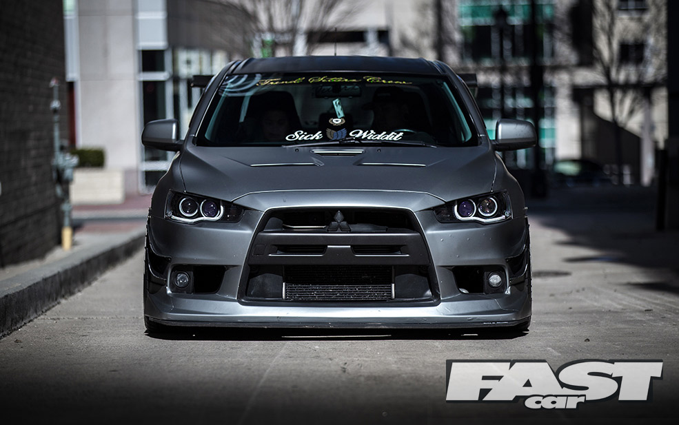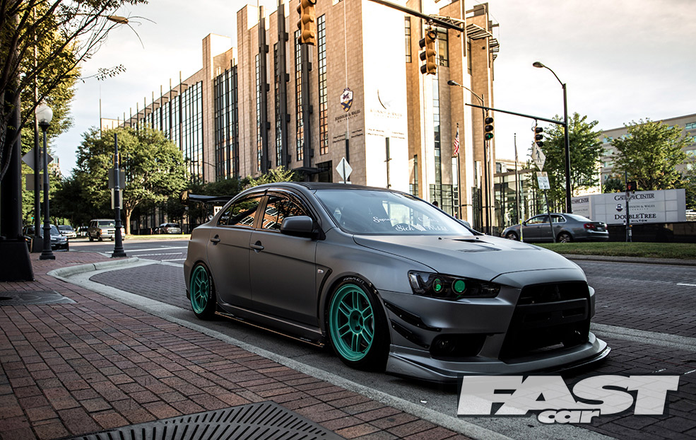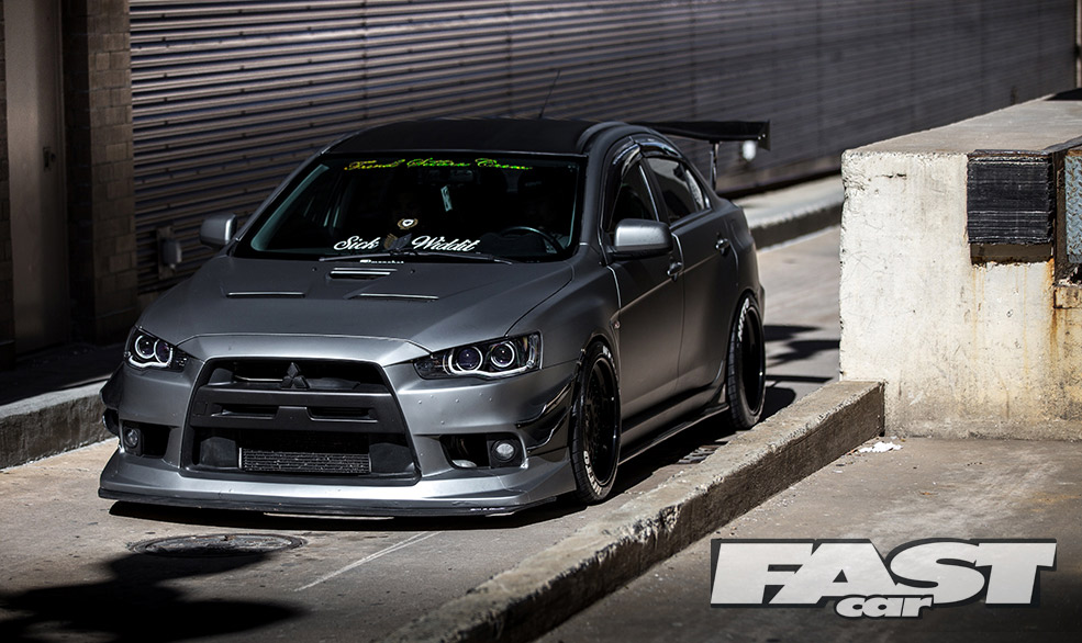 Mitsubishi Evo X with Frozen Grey vinyl wrap; custom rear wing; custom quad projector/halo headlights; Rexpeed diffuser and carbon fibre canards; AIT Racing carbon fibre sideskirts; replica Voltrex splitter.