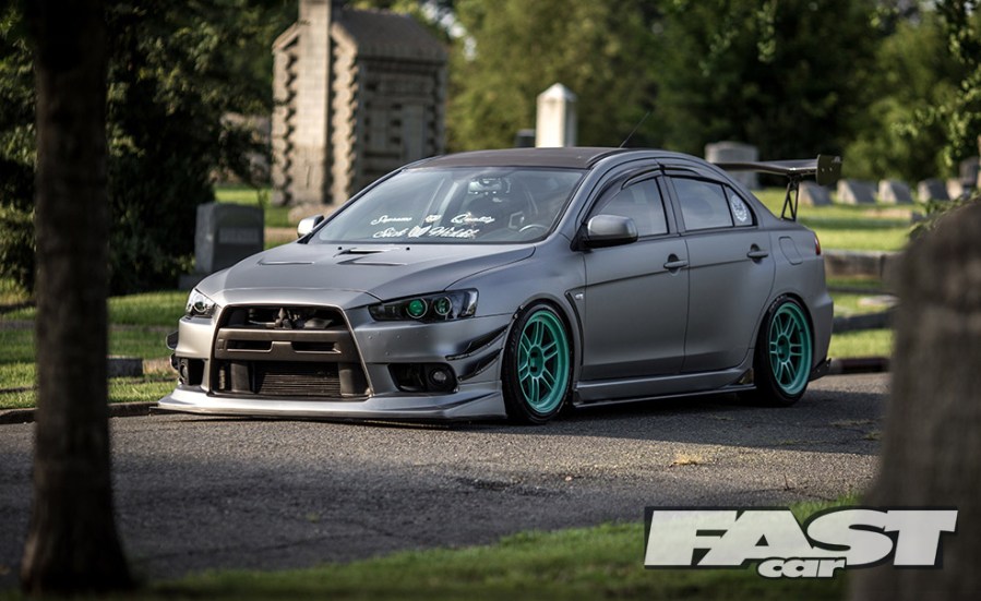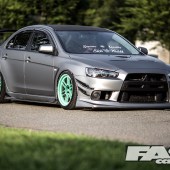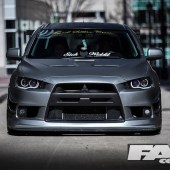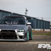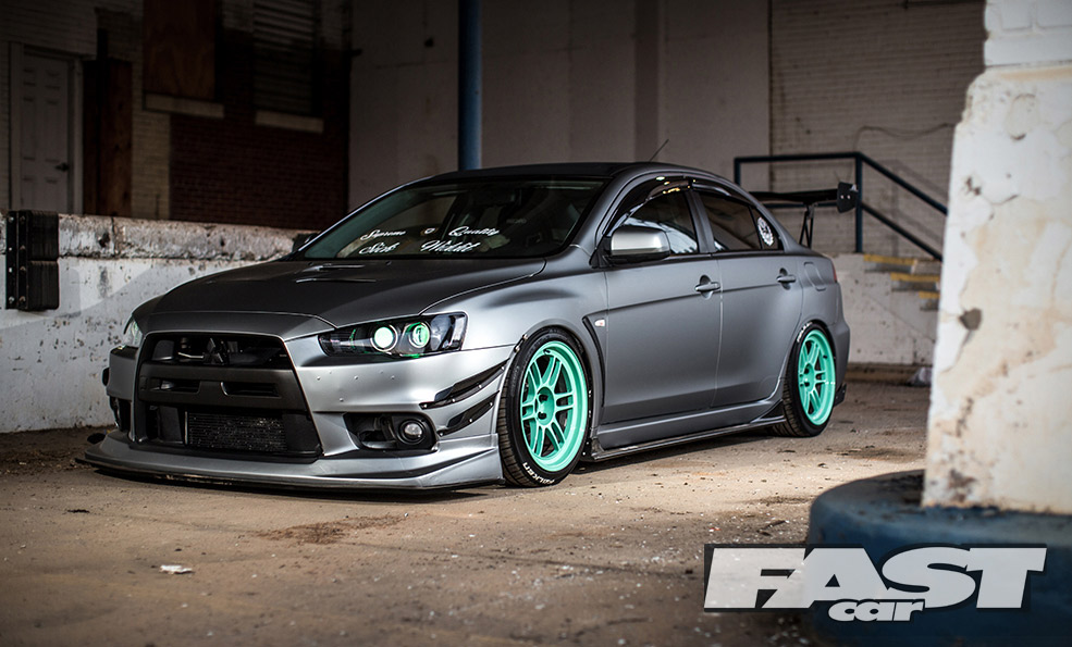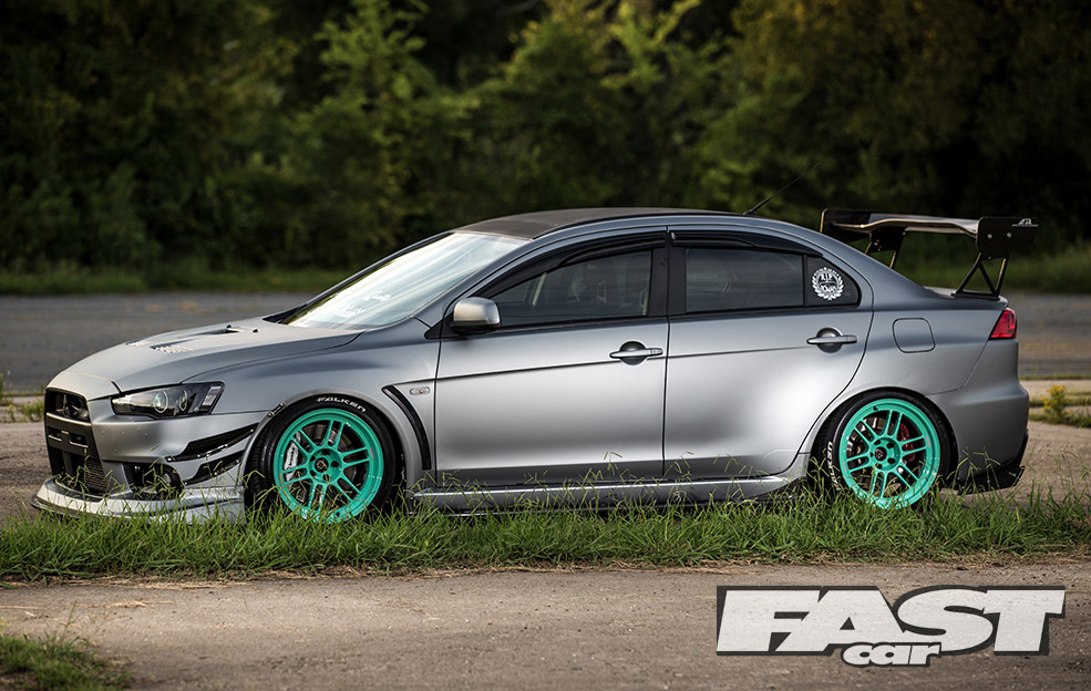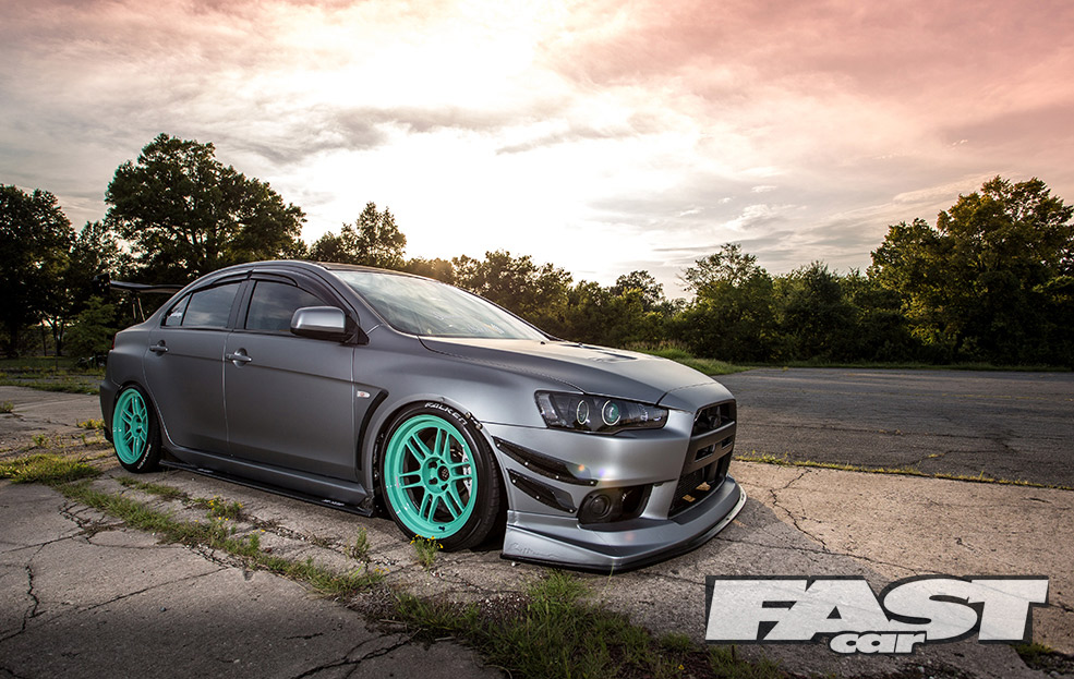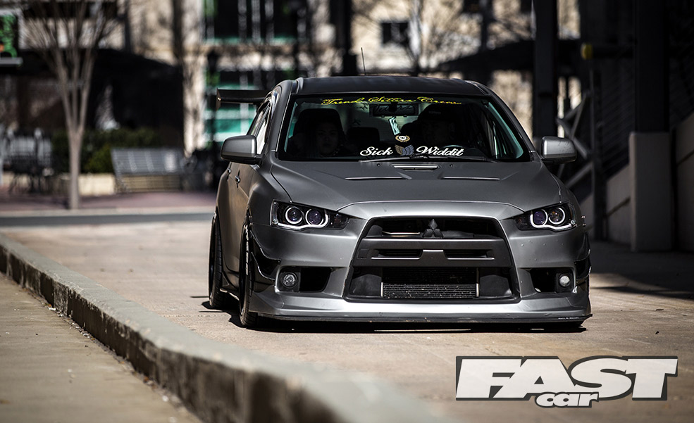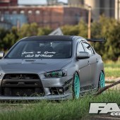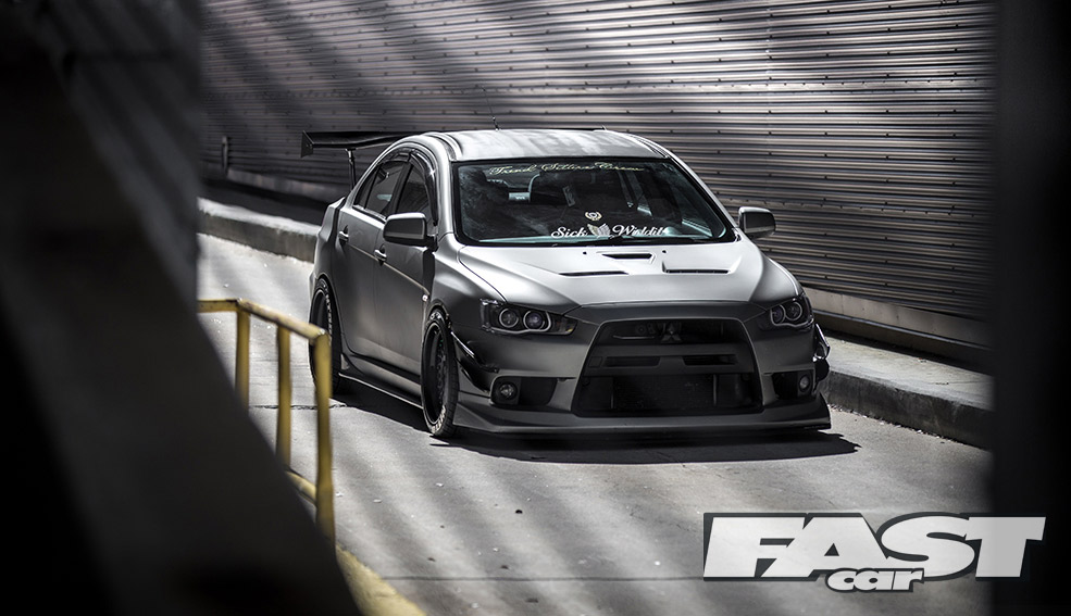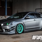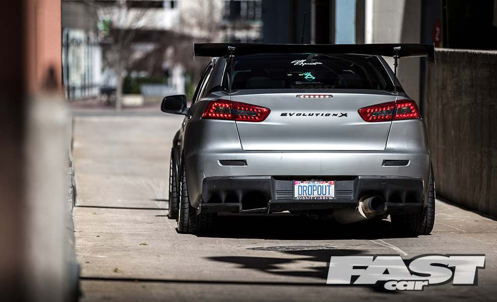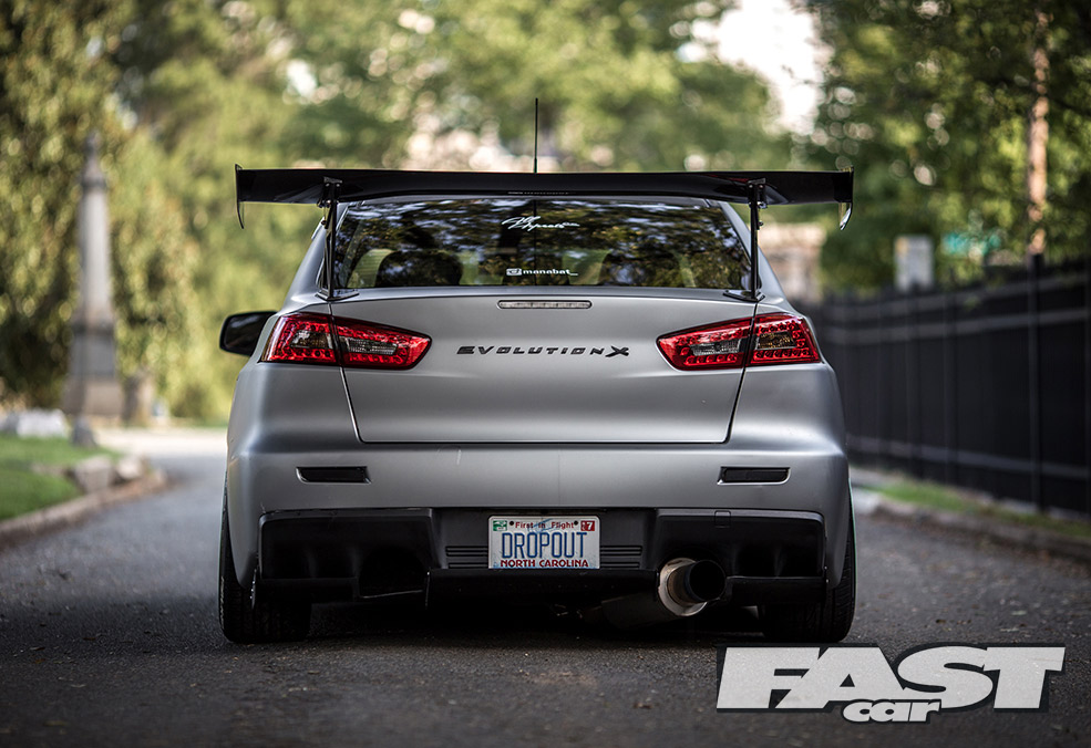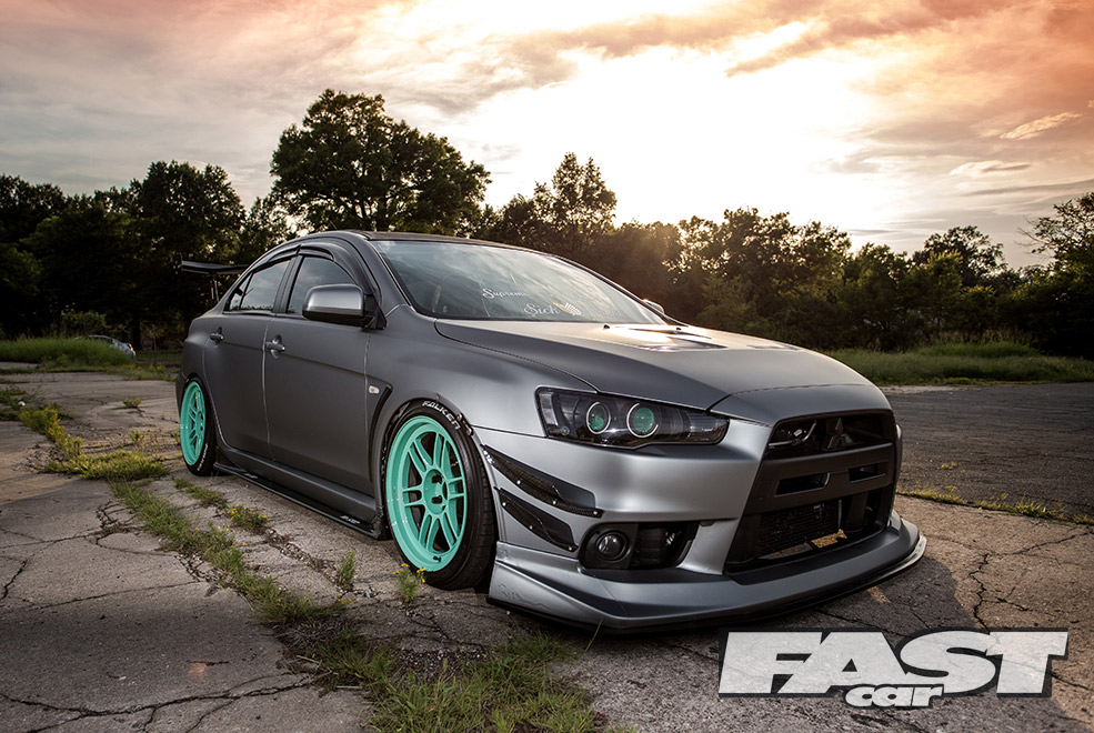 Mitsubishi Evo X with Frozen Grey vinyl wrap; custom rear wing; custom quad projector/halo headlights; Rexpeed diffuser and carbon fibre canards; AIT Racing carbon fibre sideskirts; replica Voltrex splitter.