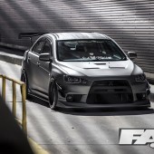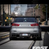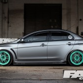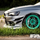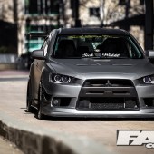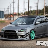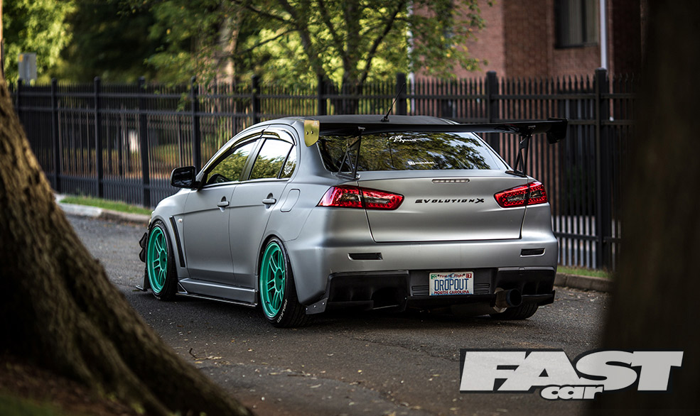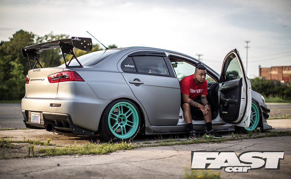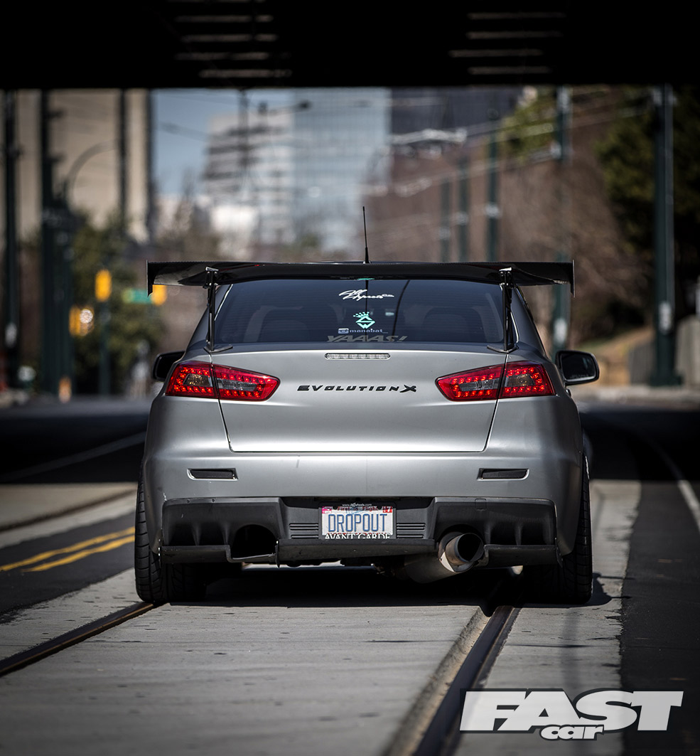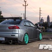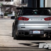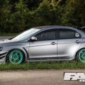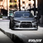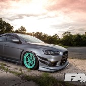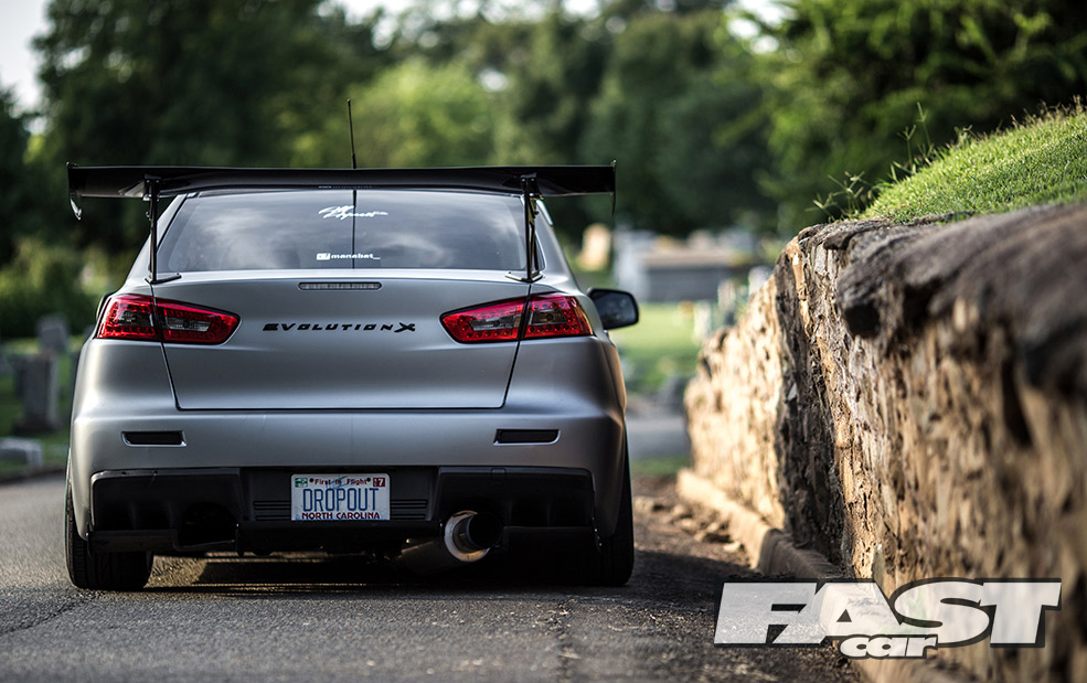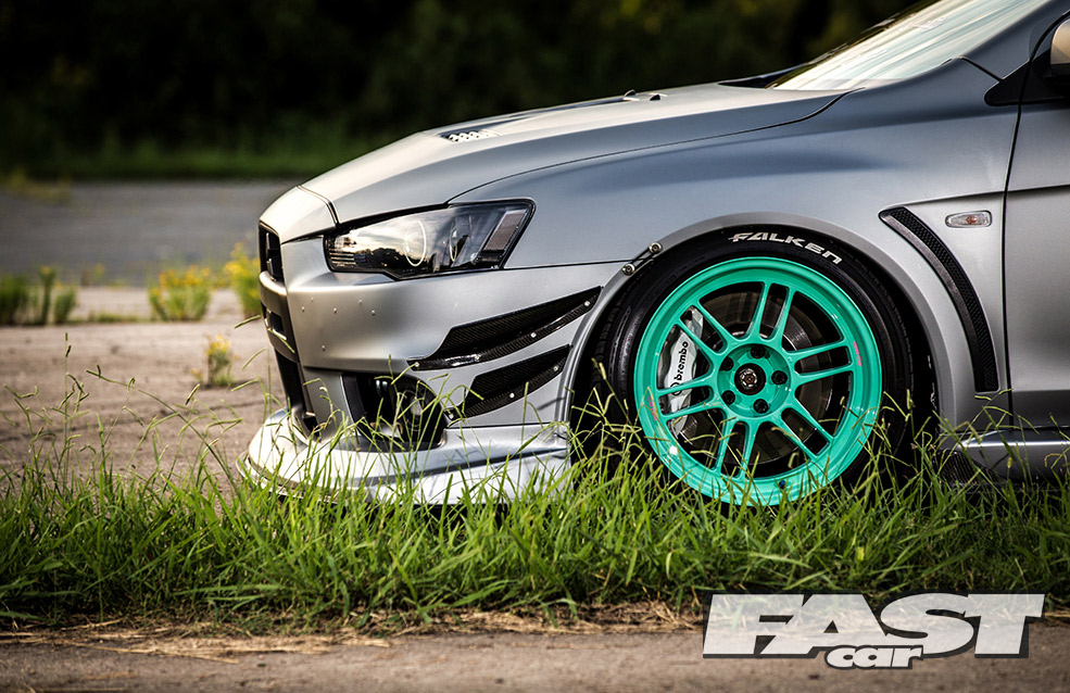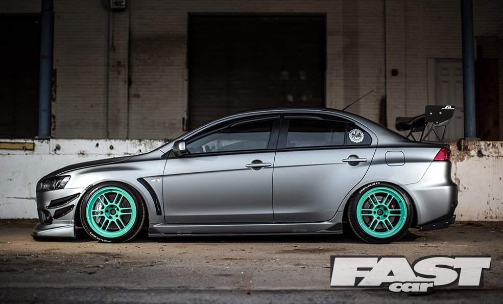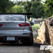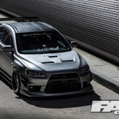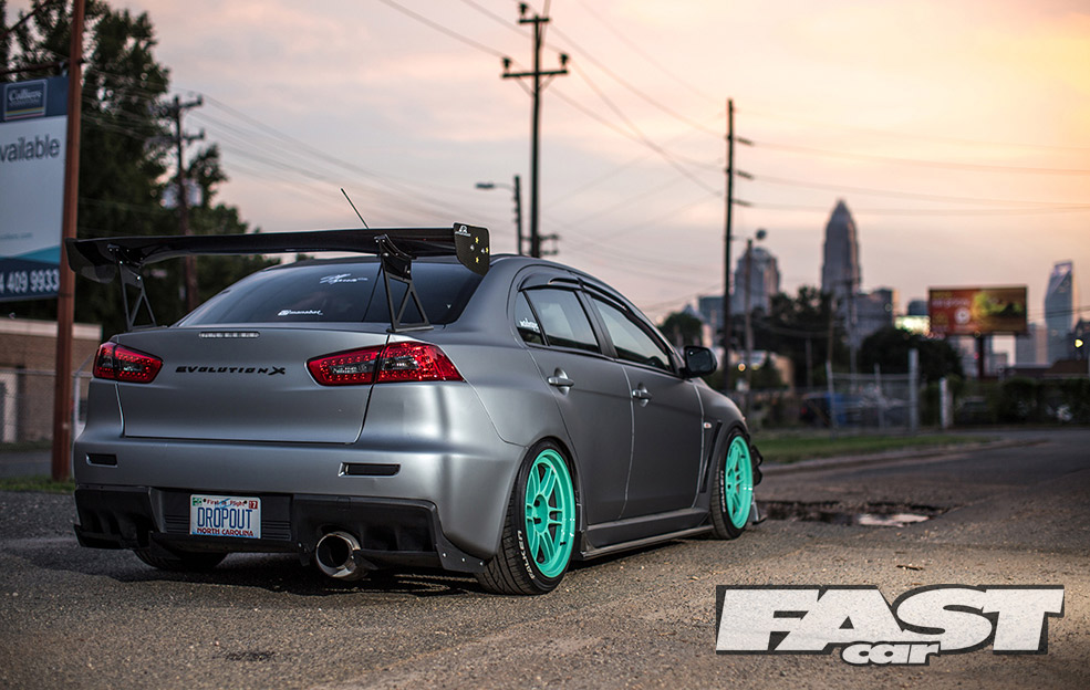 Mitsubishi Evo X with Frozen Grey vinyl wrap; custom rear wing; custom quad projector/halo headlights; Rexpeed diffuser and carbon fibre canards; AIT Racing carbon fibre sideskirts; replica Voltrex splitter.