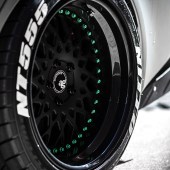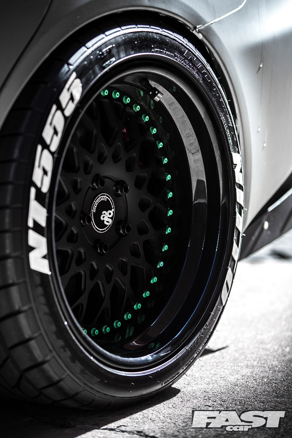 BC Racing BR coilovers all round; Whiteline KTA135 rear camber kit; Polybushes; stock brake discs and callipers; StopTech pads and stainless steel braided lines; 10x18in Avant Garde F141 wheels; Nitto NT555 275/35×18 tyres.