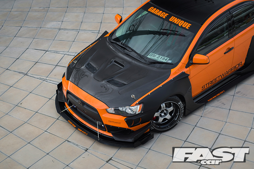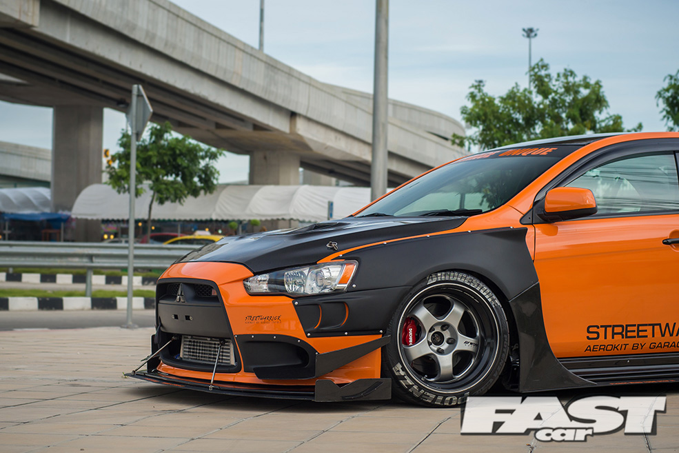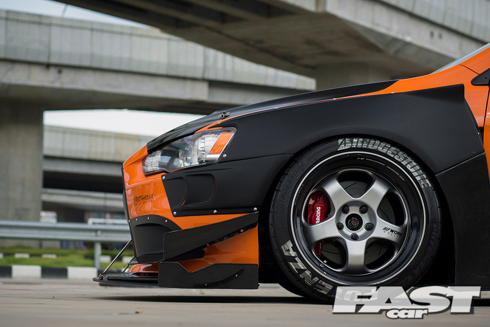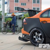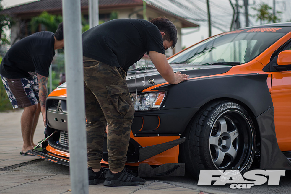 Knowing that most Lancer owners also tune their cars to look like performance variants of themselves, Win wanted to modify his in a way that would stand out differently among the crowd. Going with a complete one-off aero kit by Garage Unique was the first step in achieving this. The second was the actual paint scheme in itself. Many people in Thailand like to have their car a solid colour versus a two-tone paint or wrap. So Win decided to take the path less travelled and had the aero kit painted black to add a bit of contrast to the orange warp.
