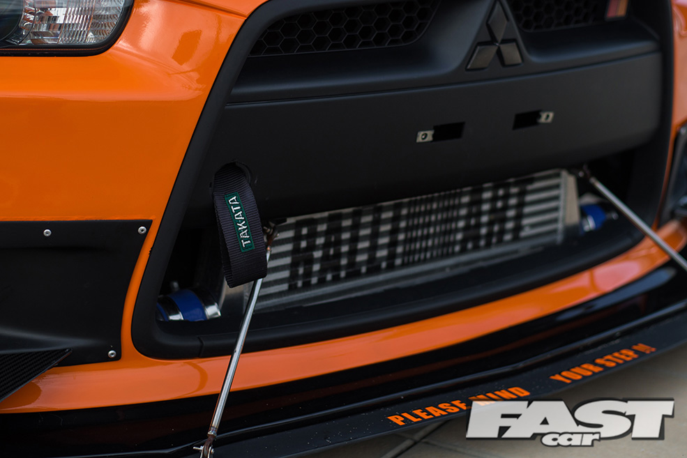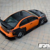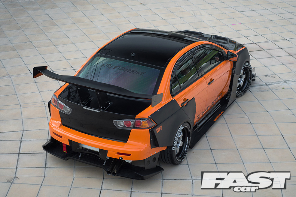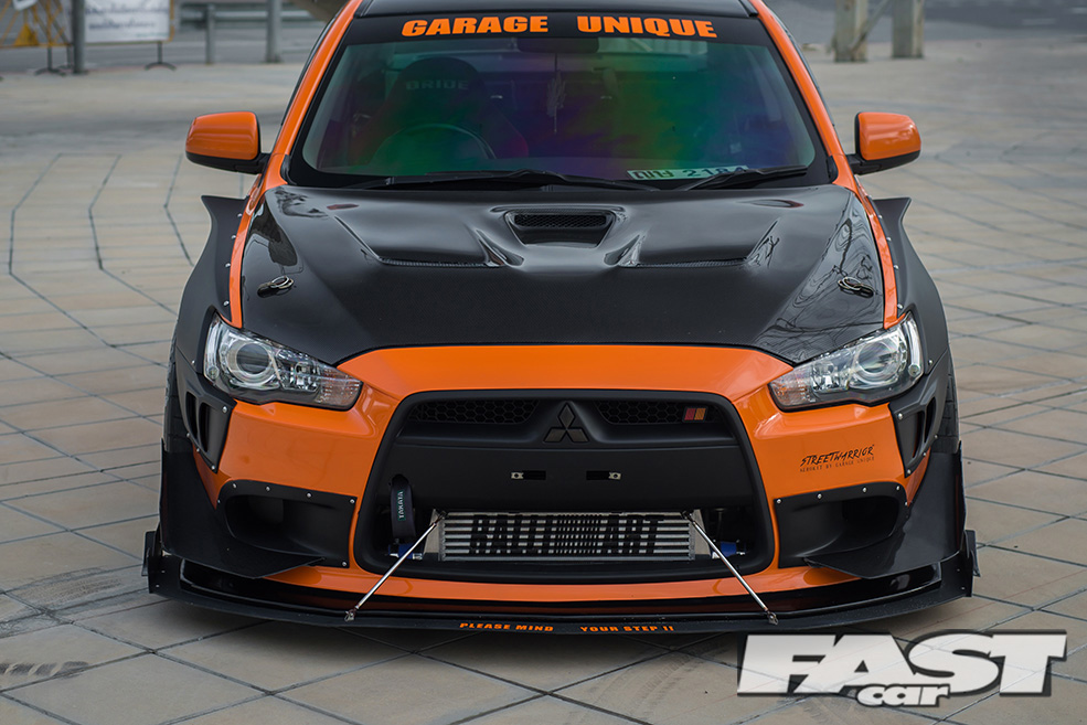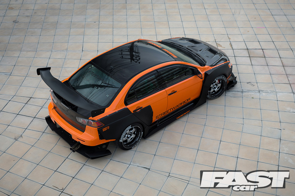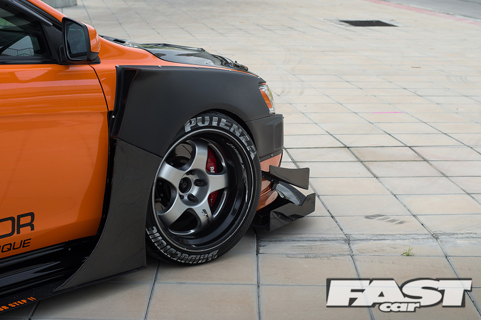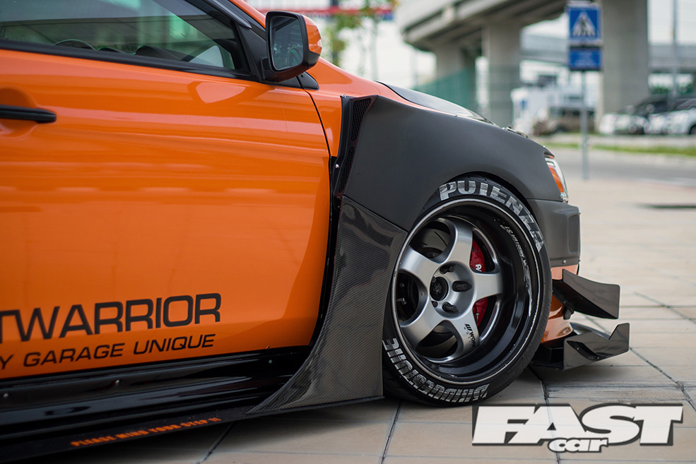 Since we are on the subject of Evolutions, it’s time to take a look at the aggressive aero kit that ultimately transforms the exterior appearance of the Lancer to an Evolution. If you had a chance to read issue 387 of Fast Car covering ‘Momm’s’ S20 Toyota MR2, you may be familiar with the styling of the kit. The same person responsible for Momm’s custom widebody kit is also the mastermind behind this widebody kit which he calls the StreetWarrior.
