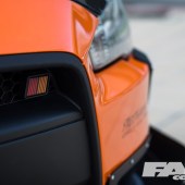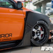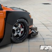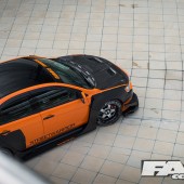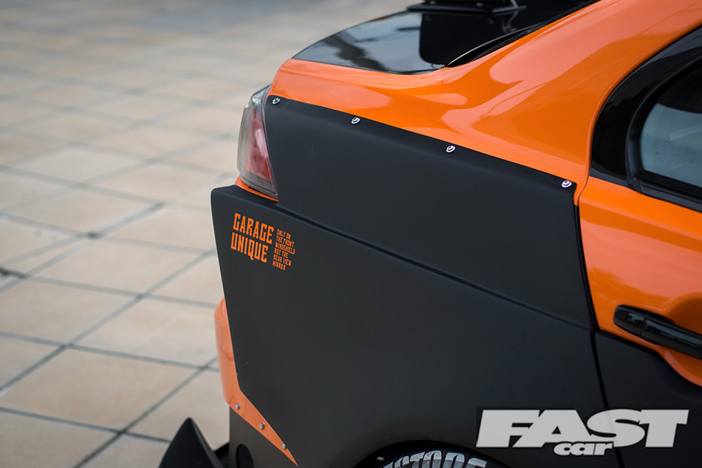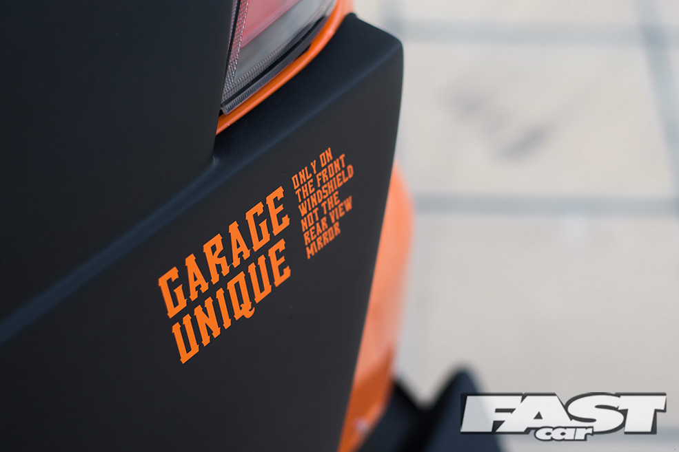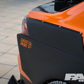 Orange wrap by Take A Wrap; StreetWarrior wide body custom kit by Garage Unique; GT rear wing; tyre paint.