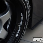 Silver Neomax coilovers with Swift F.10K R15K springs; AP Racing big brake kit; 10x18in WORK Meister S1R rims; Bridgestone Potenza RE11A 265/35×18 tyres.