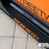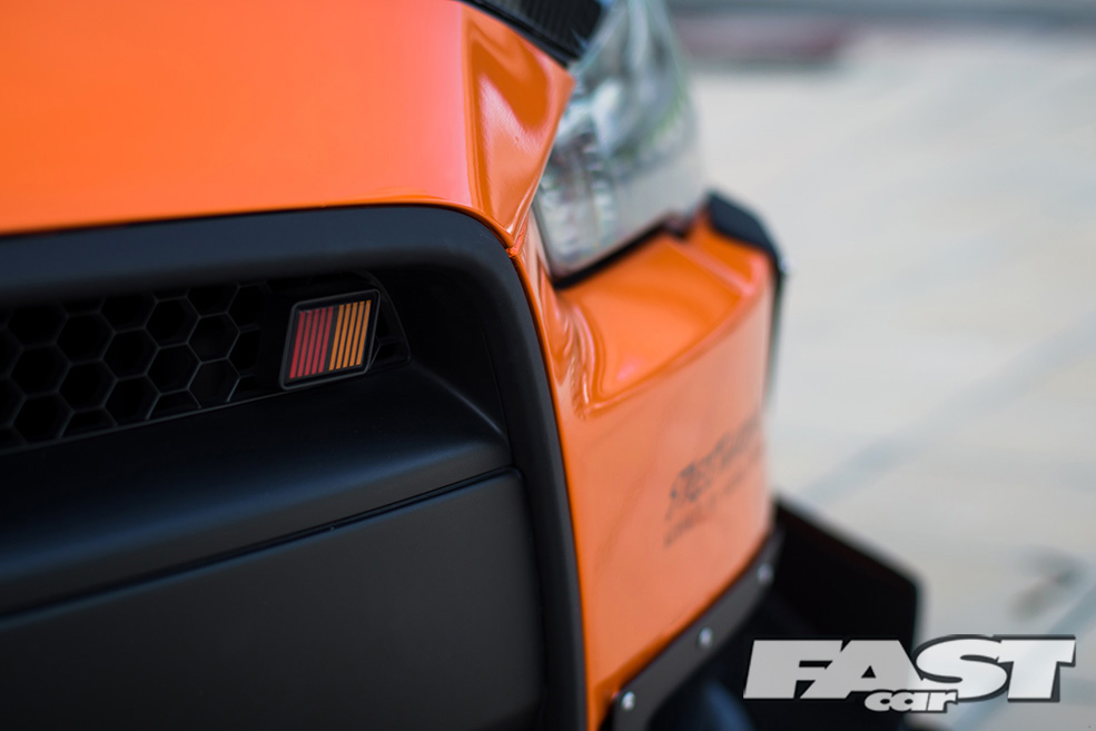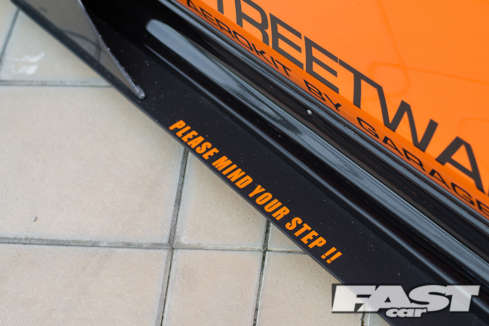 Up front hosts the largest canards and front splitter I’ve ever seen on a car that wasn’t a purpose-built Time Attack car. The “Please Mind Your Step !!” sign on the sideskirts (see overleaf) is a touch, seeing as it extends far out past the front, to the point I found myself being reminded not to step on it when trying to get up close for detail shots.