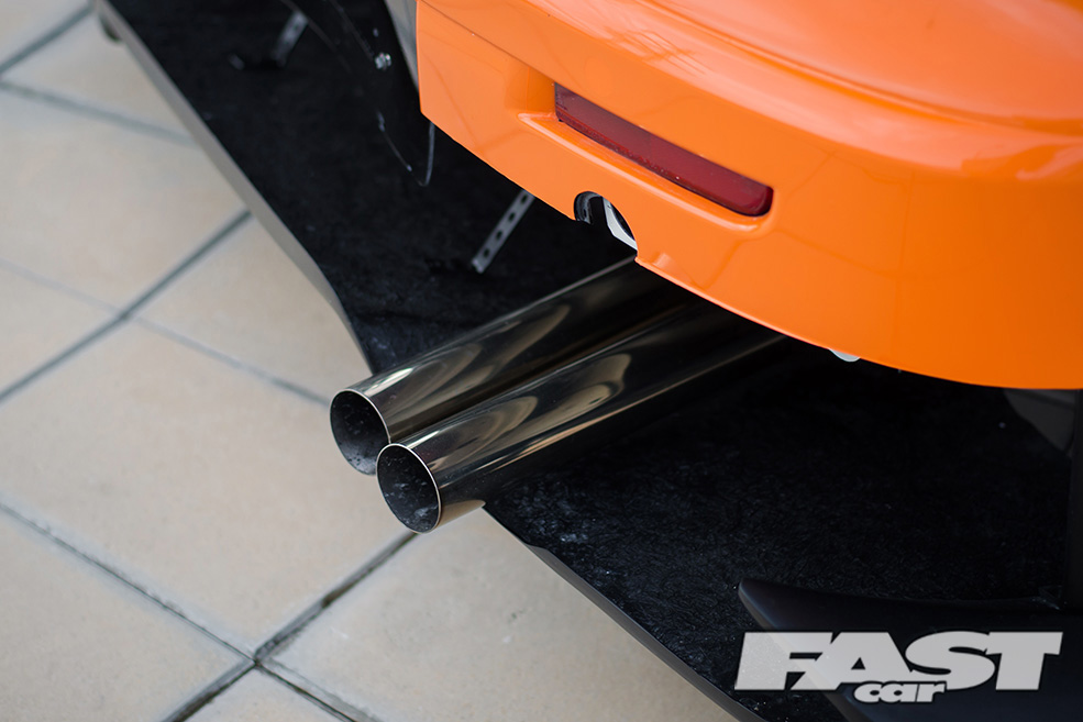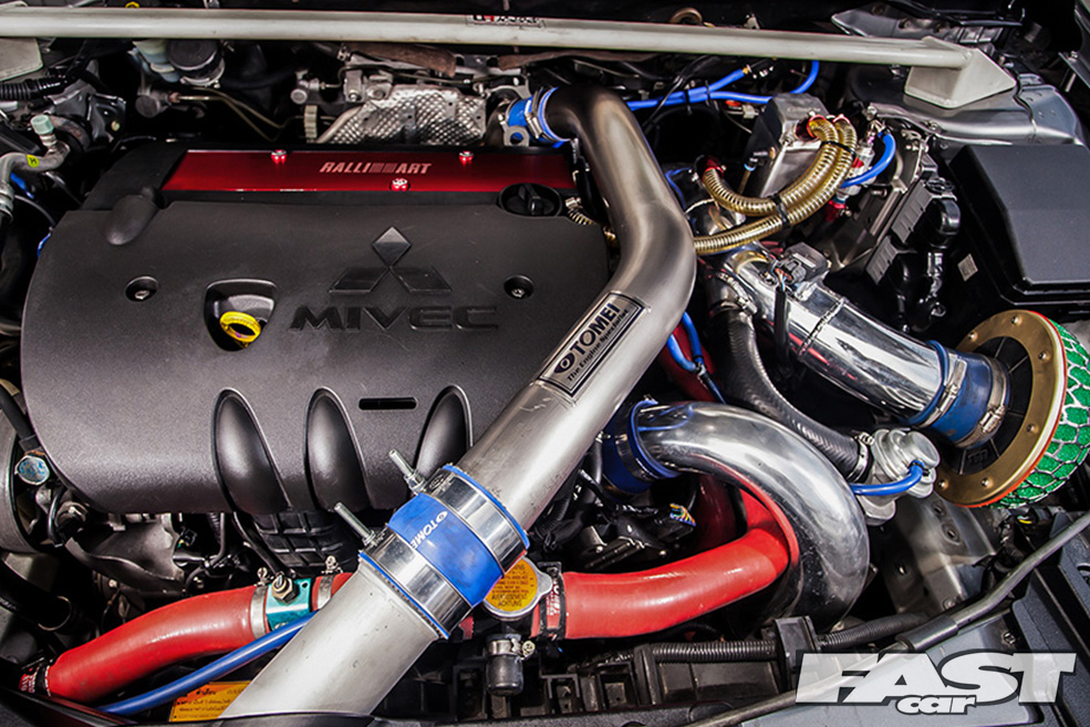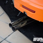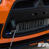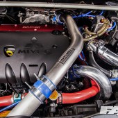 The valve train has also been modified to match the increased duration and performance of the cams and piston. ARP rods and head struts make sure everything stays together and doesn’t leak under the added boost. DW-65 fuel pumps and Dynamics ID 110 Injectors insure that the proper fuel mixture is delivered into the combustion chamber. The Lancer is now making close to around 350 horsepower to the tyres. The spent by-product of that new found power dumps out of the custom headers and out the exhaust system.