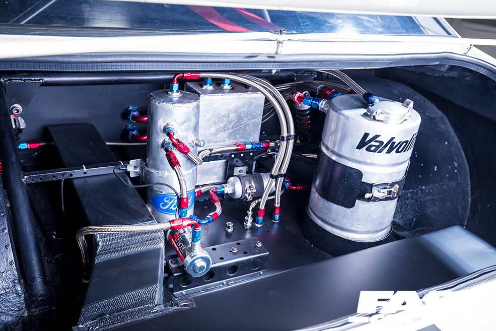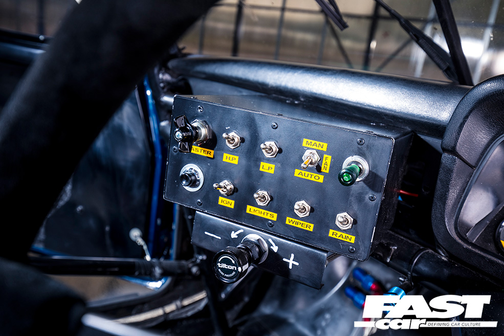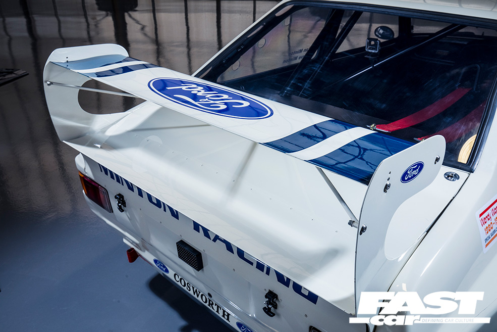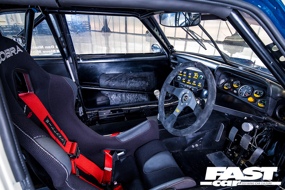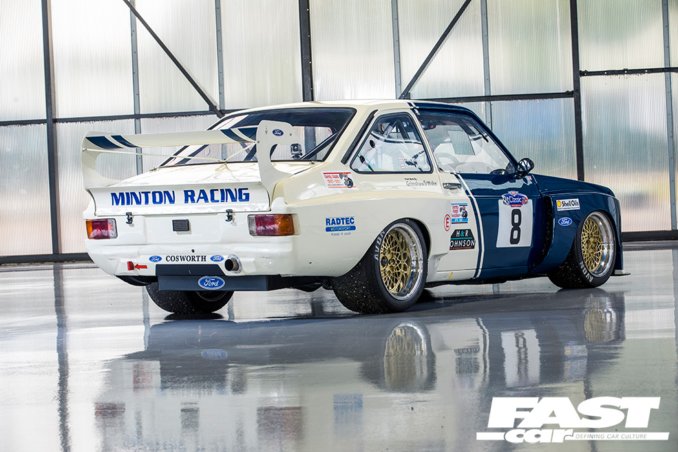 A few other period features were still in situ, which helped – not least the dry sump setup and swirl pot in the boot, which works to retain some of the old-school originality. The one-piece droop-snoot front end was in a bad way though, so the father-and-son team cut the wings off and mounted them directly to the shell, and converted the car to flat-front, putting a front bulkhead back in as this had been chopped about during the Escort’s evolution and needed remedying. This also had the benefit of making the car eligible for Group 2 racing. That’s right – the Mintons weren’t just restoring a museum piece, they were keen to get the old battler back out on track!