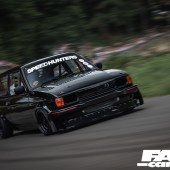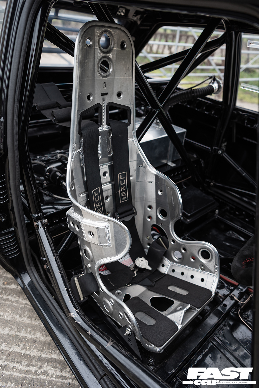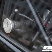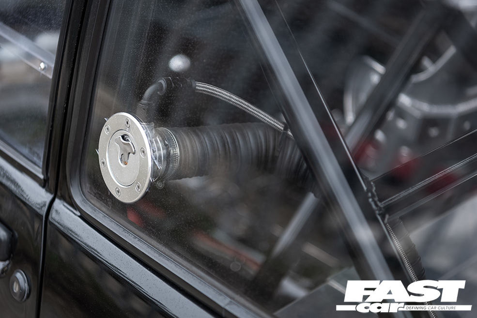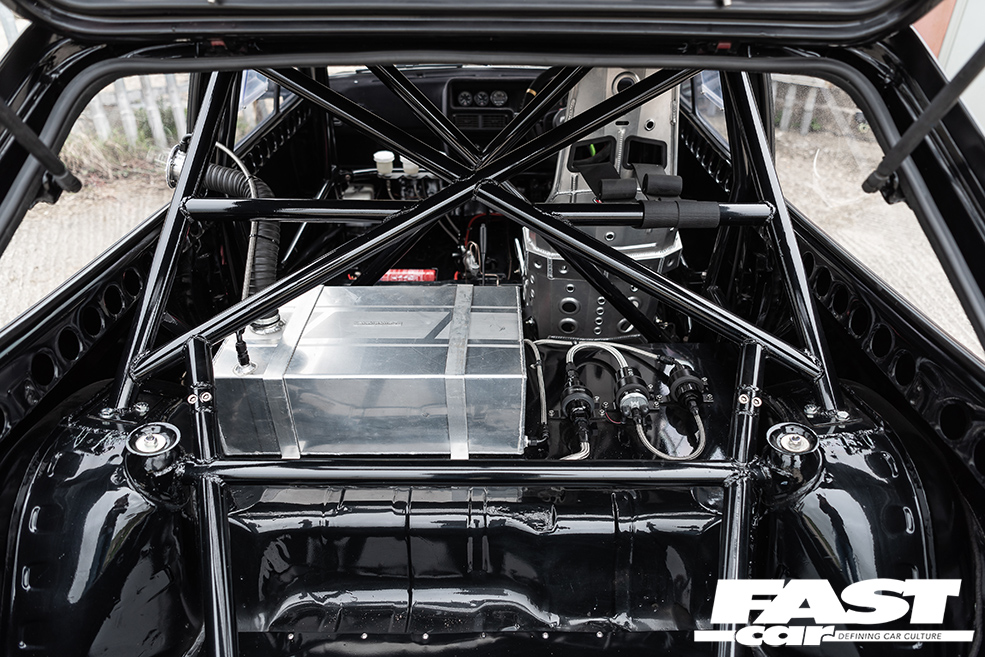 It’s just as serious inside too: everything superfluous is stripped – Liam simply straps himself into the bare-bones minimalist Kirkey seat and hangs on. The doors and inner rear quarter skins have been gutted, and everything he doesn’t need has gone in the bin. In addition, all of the fuel and brake lines now run inside the car to save them being damaged. There’s also a full suite of high-quality gauges to keep an eye on that supercharged ST170, and, of course, there’s a rollcage in there as well.