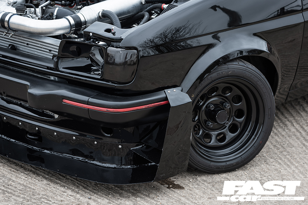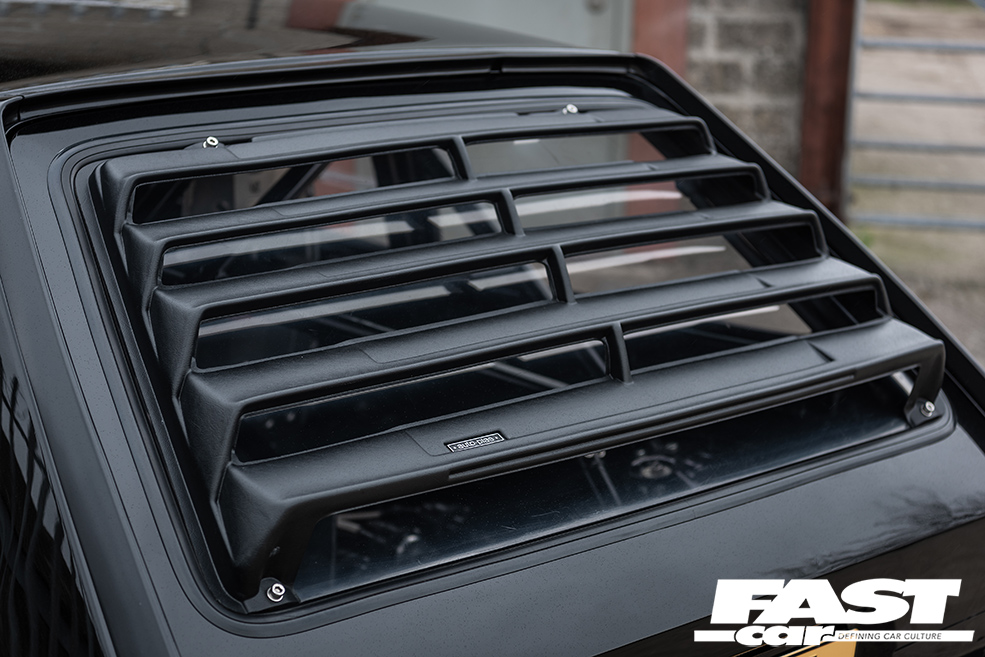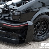The aesthetics are what draw most people in, as it really is an aggressive-looking car. The Mk2 is such a familiar shape that there’s something deliciously naughty about doing this kind of thing to it: the one-off front splitter with its jutting canards is first to grab your attention, unless you’re approaching from the rear, in which case your brain will be ambushed by the colossal diffuser. It all just looks so damned serious. The rear window louvre is there for fun, although it does neatly tie into the aero vibe, and if you’re scratching your head in puzzlement at the reprofiled arches, they’re actually a set of Mk1 Golf items that have been welded into place to shroud those fat 7×13-inch steels with their sticky square-sidewall rubber.