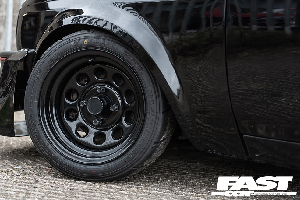 7x13in ET0 JBW pepperpot steels, 175/50 Yokohama A048-R tyres, modified Mk1 Golf coilovers, fully polybushed, custom adjustable rear beam, XR2 brakes with EBC YellowStuff pads, Matt Lewis Racing braided hoses, adjustable bias pedal box with remote reservoirs, hydraulic handbrake