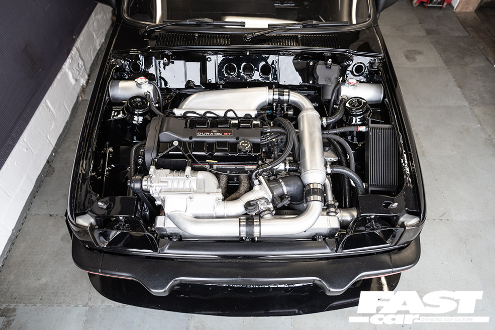 ST170 2.0-litre Zetec, ME221 ECU and loom, Eaton M45 supercharger (from Mercedes SLK230 – currently running 5-6 psi boost), stock internals, custom billet crank overdrive, Crazycage inlet manifold and engine mount, Vibra-Technics engine mounts, air-to-water chargecooler, 2.5in stainless side-exit exhaust system, Kubota lightweight alternator, FPE baffled sump plates, Sierra RS Cosworth alloy radiator, baffled aluminium fuel tank, Torques fuel filters, Sytec fuel pump and regulator, Mk6 Escort IB5 gearbox, Quaife ATB limited slip differential, converted to hydraulic clutch with Wilwood pull slave, Fiesta turbo flywheel, AP Racing 4-paddle clutch, rebuilt stock 1.1 driveshafts