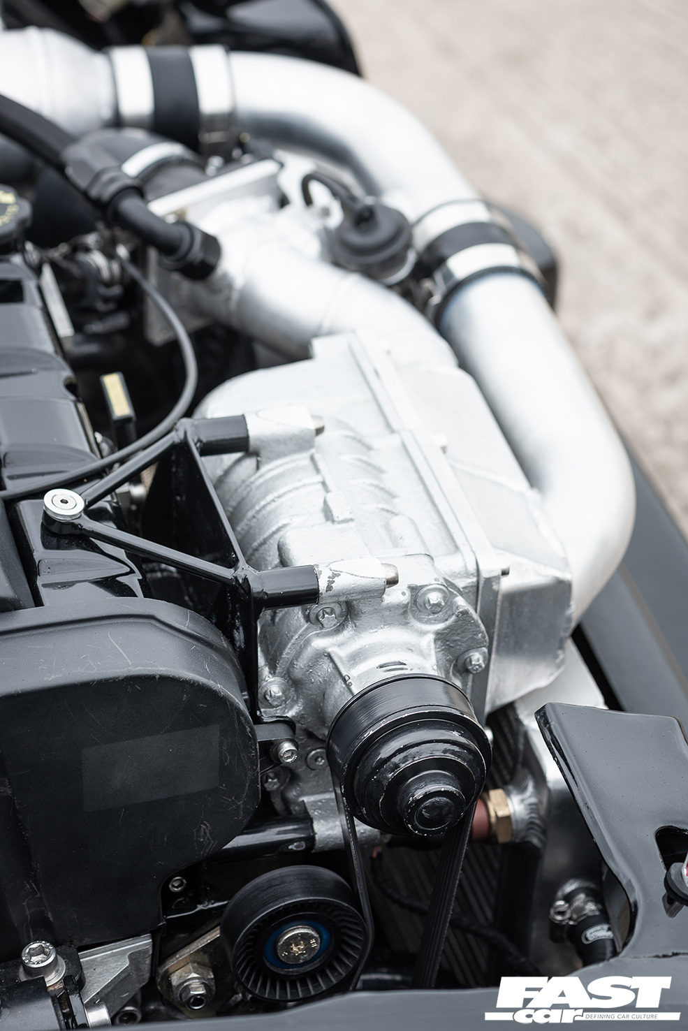 Yep, this is a guy who certainly doesn’t do things by halves, and he’s also incredibly keen to get stuck in and do everything himself – fabricating, welding, painting, you name it. It took three years of solid graft to transform the Fiesta into what you see today, and what’s emerged from the workshop is something really quite splendid. The supercharged element of the build involved bolting the Eaton M45 blower from a Mercedes SLK230 to the ST170 engine, and, of course, there are quite a few knock-on mods that had to be carried out to suit. Liam’s fitted an air-to-water chargecooler, and there’s also a Crazycage inlet manifold, a Sierra RS Cosworth alloy radiator, a 2.5-inch stainless exhaust system that exits to the side, and it’s all governed by an ME221 ECU. The upshot of these monkeyshines is a safe 198bhp on the freshly rebuilt engine, which is running 5-6psi of boost with its stock internals. A strong and usable power level, with easy potential for more as the project evolves.