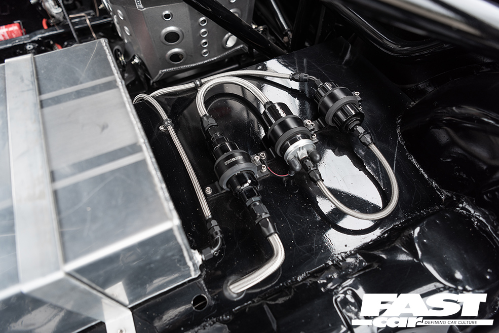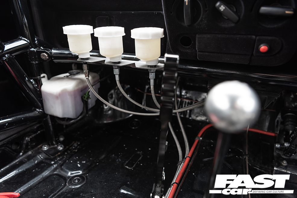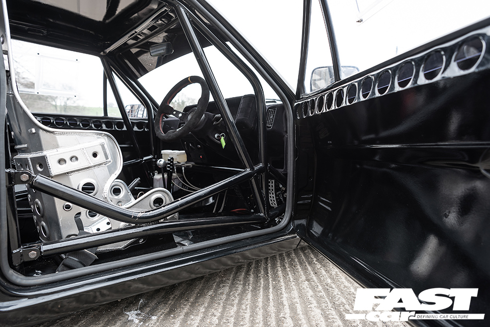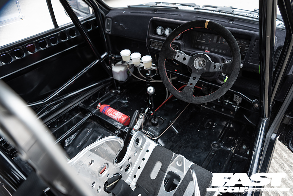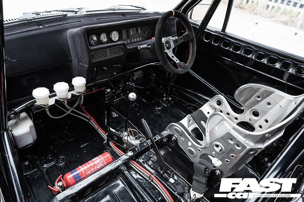 Naturally there’s an LSD to help deploy all of this – a Quaife ATB, which works hand-in-hand with a Mk6 Escort IB5 gearbox, and a hydraulic clutch conversion with a AP Racing 4-paddle clutch. Intriguingly, the car’s running the spindly little driveshafts from a 1.1 Fiesta. “They’re like matchsticks, but they’re holding on strong!” Liam laughs.