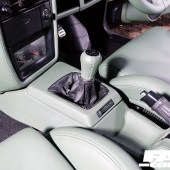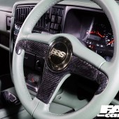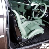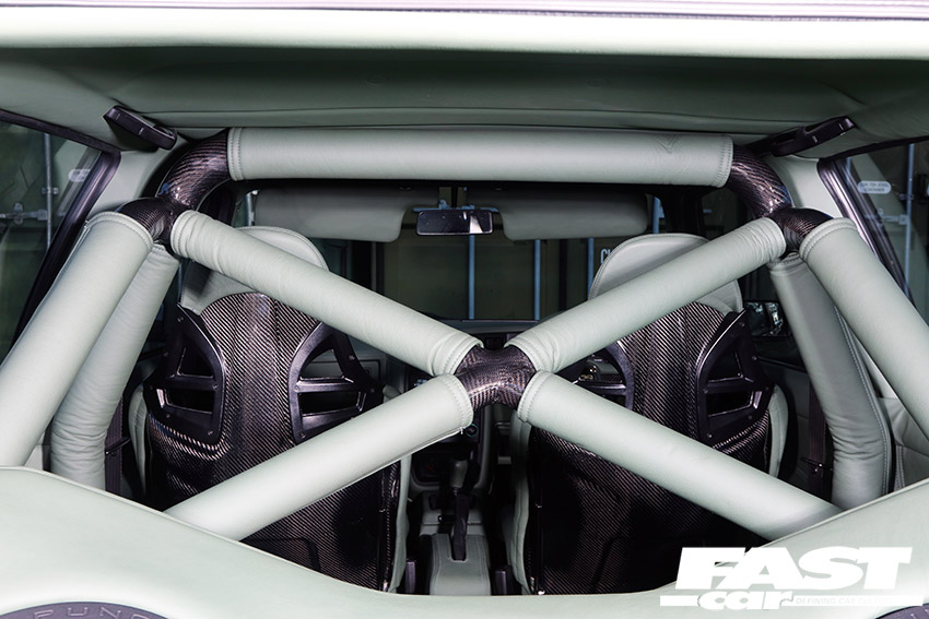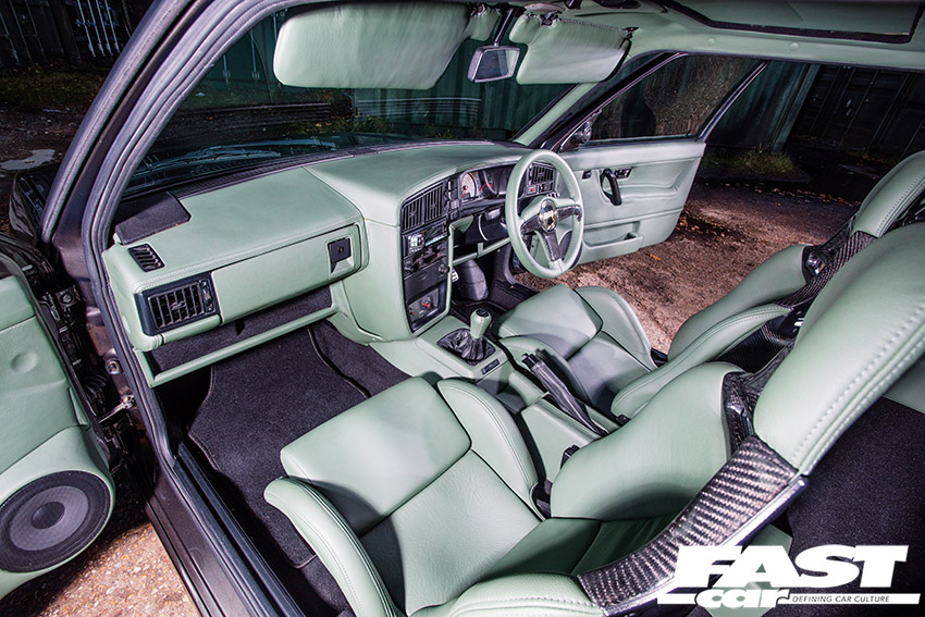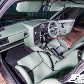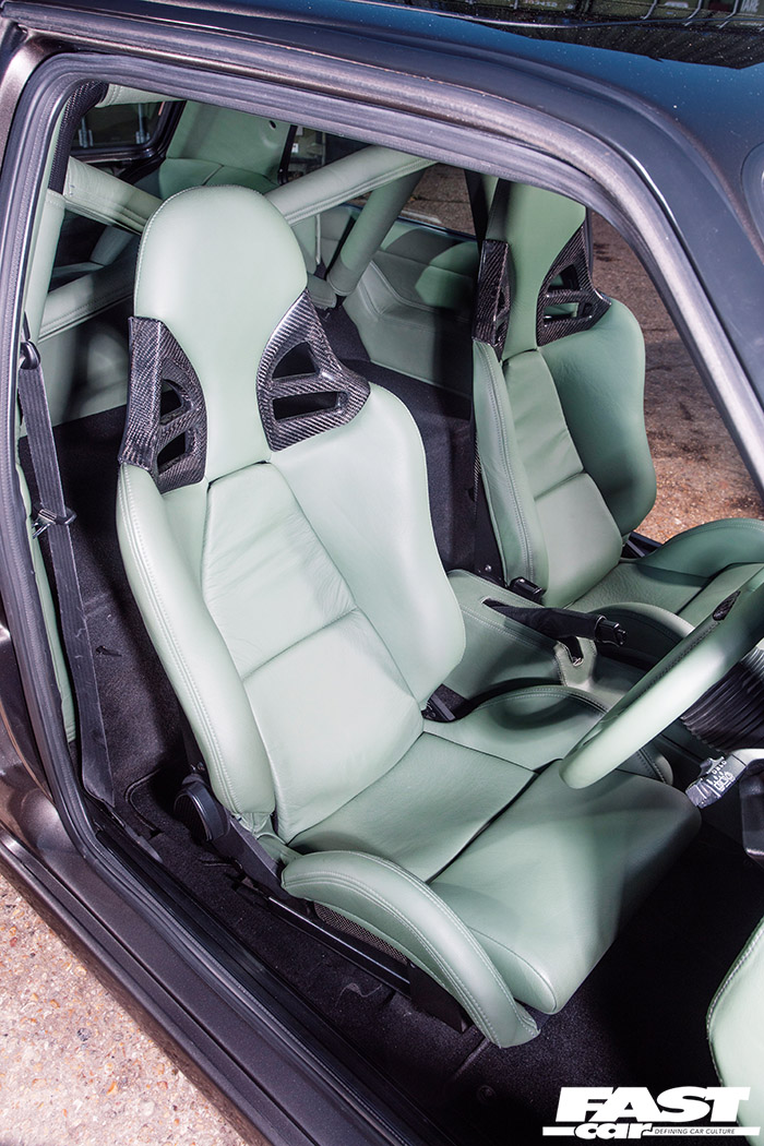 Corrado dash, centre consoles and under trays, gear knob, Porshe GT3 carbon fibre front seats all retrimmed in green leather. false floor and custom-made rear boot build, Flowtech rear custom-made roll cage wrapped in leather and skinned Carbon fibre. Custom made tweeter door pods, door lever and grab handle skinned in carbon fibre. Bbs steering wheel leathered with the centre trim skinned in carbon fibre