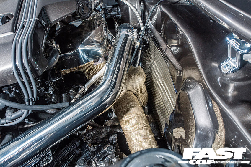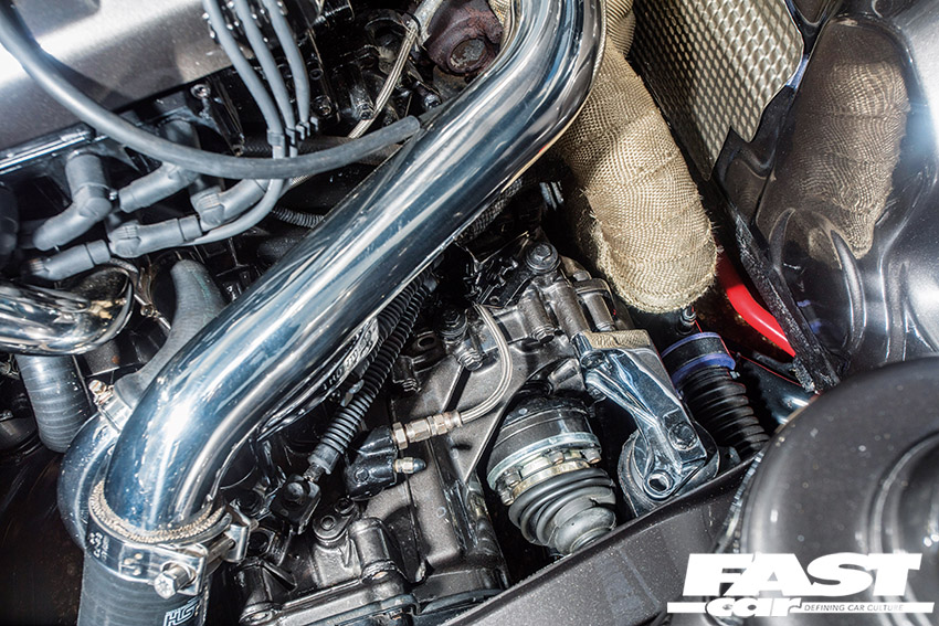 With the car back in Vic’s garage the block was painted black, the upper inlet, rocker cover and gearbox were also colour coded to suit and he got stuck into extending and hiding the wiring loom in the chassis legs. “it was time consuming but not too complicated to do as it splits off to each component as it needs to.” There’s also a 6-puk racing clutch in there that Vic says, “is surprisingly easy to live with,” but the real art in the bay comes in the form of the cooling system, turbo setup and PAS plumbing, all of which are brilliantly packaged and stealth like. “I had to totally redesign the cooling system without an expansion tank.