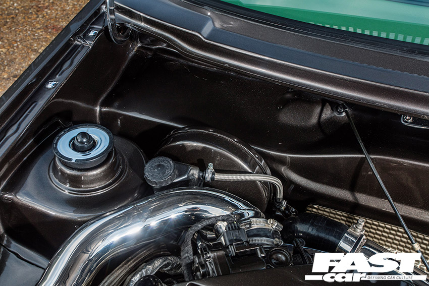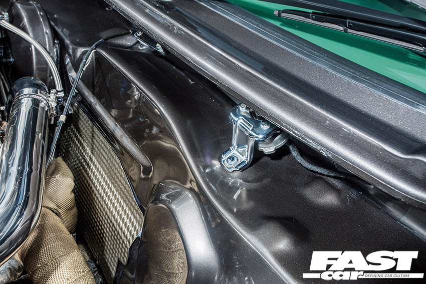 While the bay was bare he couldn’t help staring at it thinking, “This is the perfect time to smooth it all out.” So with chisels, drill, hammer, grinders and anything else Vic could muster he set to removing the coolant bottle bracket, drip tray, power steering brackets and any other item that stood in way of cleanliness. Hell bent on a full-on show stopper, it then dawned on him that it now needed to be painted following an awful lot of crash, bang, wallop. “