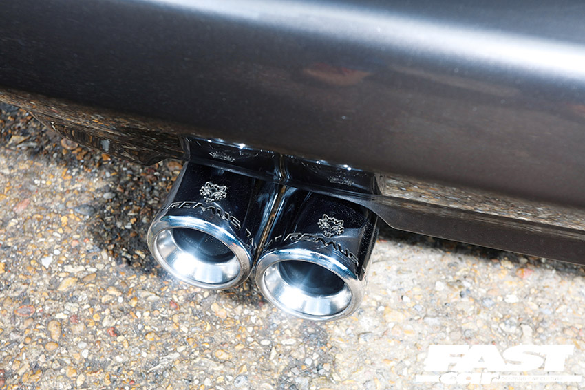 Dropped on old skool AVO coilovers (if it ain’t broke, don’t fix it – ED) the ride height is quite literally mental for a static machine with such a honking powerplant up front. In fact, we naturally assumed it was on air when we arrived for the snaps. The brakes have been uprated, too, with Tarox B32 6 pot calipers and matching 320mm discs up front and Tarox 280mm rear discs with Mk4 Golf ally calipers out back.