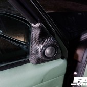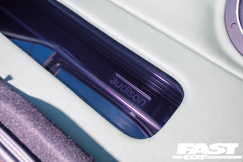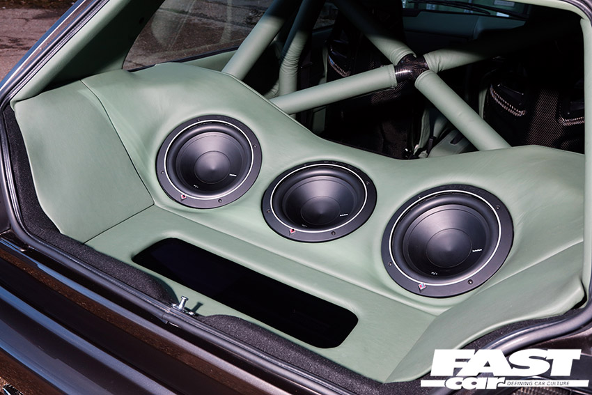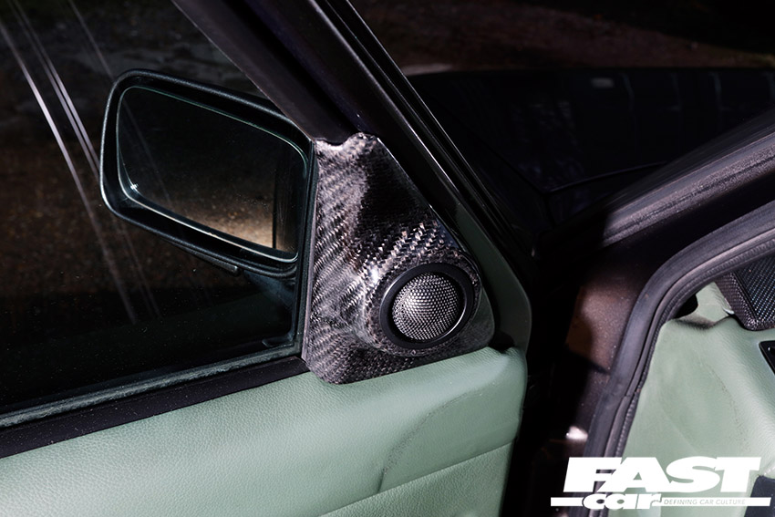 With patience, time and amazing attention to detail, Vic has become quite the carbon fibre expert, and his carbon craftsmanship can now be seen throughout the car. “I researched the procedures and got cracking on with it, and to this day now I’m so glad that I did it as I am getting jobs out of this.” Having made some tweeter pods using the existing door mirror interior covers, the carbon fibre twill now also wraps around interior grab handle inserts, door lever, rear ashtray lid and the front seats grab handles – he become quite the connoisseur. The end result of the moo cow with a bad cold (it’s green!) is truly second to none, and because Vic is all about that back to the 90’s vibe, there’s also a hefty dose of bass as well, thanks to a boot build that benefits from an Audison VRX420 amplifier, 3 ten inch Rockford subs and some Infinity components up front for the tingling, high end stuff.