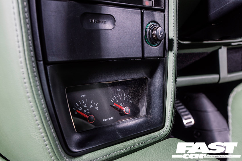 It is an all-consuming machine this tuned Mk2 Golf VR6 turbo, there is literally no stone left unturned and every possible element of the car has been lovingly reworked. So, with everything looking up to spec, Vic soon realised that flogging his Audi S3 interior perhaps wasn’t such a clever move. Then the idea came to him, An early Corrado dash is in my opinion the best-looking dash in a Mk2. Some nice bucket seats, no rear seats and some sort of boot build – sounds really easy, right?” Questions Vic. He already a Corrado dash in the loft so he started trimming it down where the edge meets the windscreen, this had to be done perfectly to leave no gaps as it’s an area that’s well exposed through the windscreen. He also had to move the brackets slightly which go through the bulk head and modify the steering column bracket for clearance for the clocks, but the fit and finish inside remains first class. Let’s not forget either that the Corrado uses the same 4wd chassis as the G60 and the Rallye, so even the gear shifter surround had to be altered so there wasn’t a big gap between the gear selector surround and the centre console. The exquisite dashboard and centre console fitment remains the area most often asked about when Vic is on the show ground.