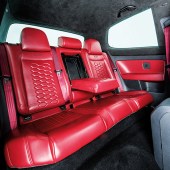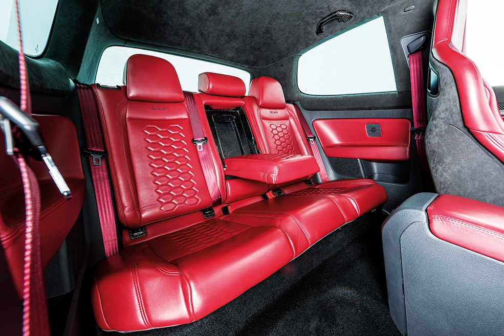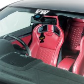 Recaro CS seats trimmed in red nappa leather with custom hexagonal stitchwork to match front grille; rear seats, doorcards, lower dash, armrests, parcel shelf and gaiters trimmed in matching leather with hexagonal stitching to rear bench, central rear armrest and parcel shelf, US driver’s doorcard fitted to passenger door with modified door handle and switch relocation, Mk6 window, headlight and fuel cap switches, Recaro seat rear shells trimmed in Alcantara, Alcantara-trimmed upper dashboard, door roll tops, headlining, sun visors and all pillars, Alcantara and carbon fibre trimmed Mk6 Golf steering wheel, carbon fibre Highline clocks, ignition shroud, dash inserts, lower grab handles, glovebox handle and air vents, carbon fibre centre console with RTA Fabrication iPad conversion, carbon fibre door strips, interior door handles and door triggers, carbon fibre rear view mirror, grab handles, interior light surrounds and alarm sensor, carbon fibre rear armrest insert, rear seat releases, seat belt guides and ISOFIX points, Red Wine seat belts, Helix DSP Pro with Director controller flush-mounted in roof lining, Rockford Fosgate Power T4652-S 3 component speakers, Rockford Fosgate Power T800-4AD 4-channel amplifier, Rockford Fosgate 12” T1D212 subwoofer, Rockford Fosgate Power T1000-1BDCP mono amplifier, The Install Company custom rear audio and air build trimmed in Alcantara with accent LED lighting throughout, carbon fibre seamless air tanks, Swagelok stainless compression fixings and polished hard lines