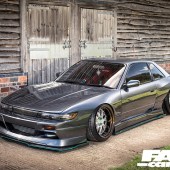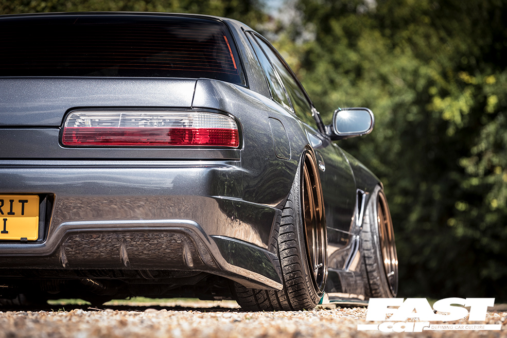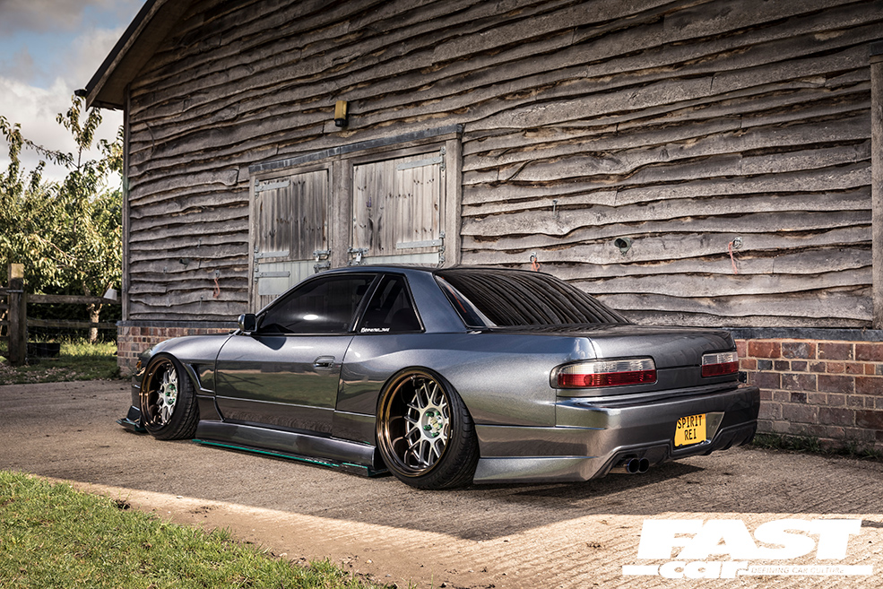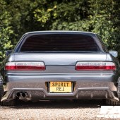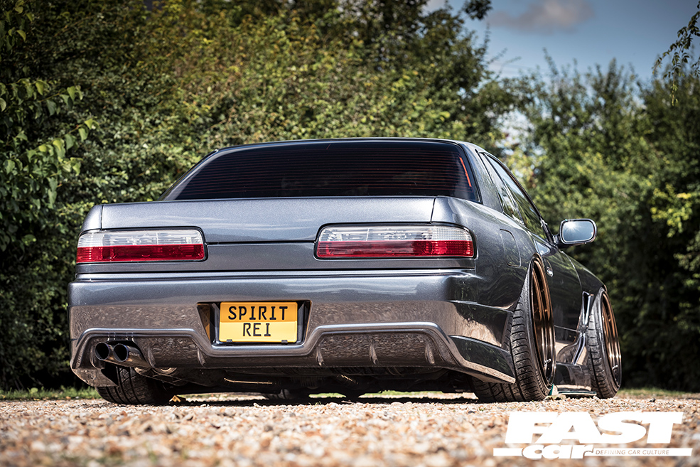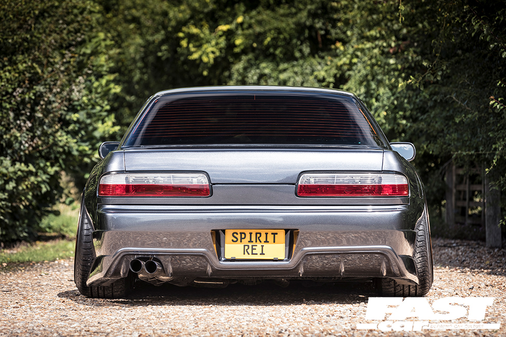 Spirit Rei ‘Miyabi’ bodykit, carbon fibre rear bumper with integrated diffuser, +40mm front wings, +65mm rear wings – blended and smoothed, Kamikaze custom carbon fibre side lips and front lip, swooped rear body sidelines, xenon PS13 glass ‘brick’ headlights