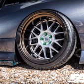 10x18in -16 (front) and 11.5x19in -43 (rear) WORK Meister M1R wheels, 225/40 (f) and 255/35 (r) tyres, R32 Skyline GT-R brakes all round, Cusco front and rear strut braces, 326Power coilovers – 32k front / 20k rear springs, JDM Skipper hydraulic lift cups system, extended front lower arms, Pilot tension rods, reinforced tie rods