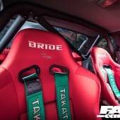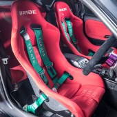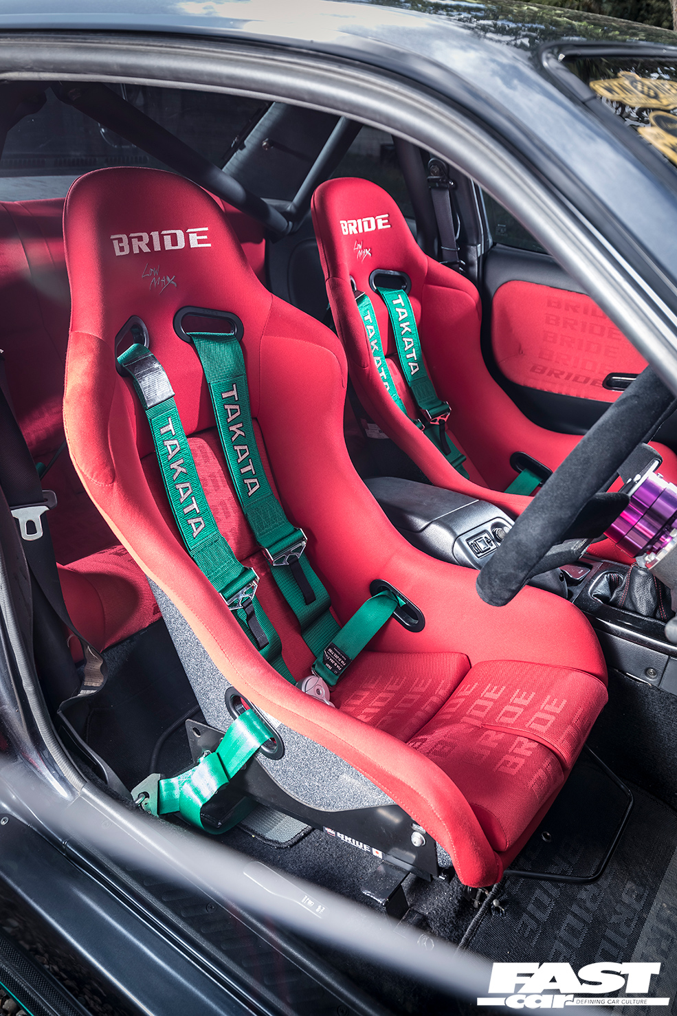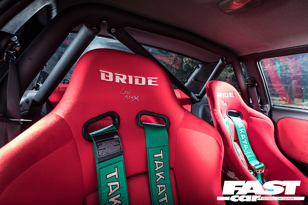 Bride VIOS seats, genuine Bride rear bench, Bride doorcards and glovebox, Bride floor mats, Takata harnesses, 5-point custom half-rollcage, one-off Spirit Rei x Nardi steering wheel
