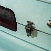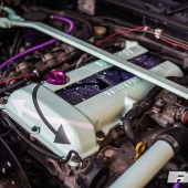 Origin fibreglass 100mm overfenders and 100mm wings, DMAX fibreglass side-skirts, roof spoiler and front and rear bumpers, Origin boot spoiler, clear brick-style headlights, tinted amber corners, tinted rear lights, carbon fibre fuel cap and B-pillars, custom pastel mint paint, custom No2TheSame livery