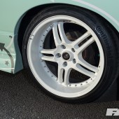 8.5×18” (front) and 9.5×18” (rear) Wolfrace Shark wheels, 225/40 tyres, 326 Power coilovers, camber-adjustable top mounts, -6 degrees front camber, Driftworks Geo2 lock kit, extended custom tie rods, R33 Skyline front and rear brakes, R33 Skyline LSD, Skyline front and rear hubs, Hel braided brake lines, Wilwood hydraulic handbrake