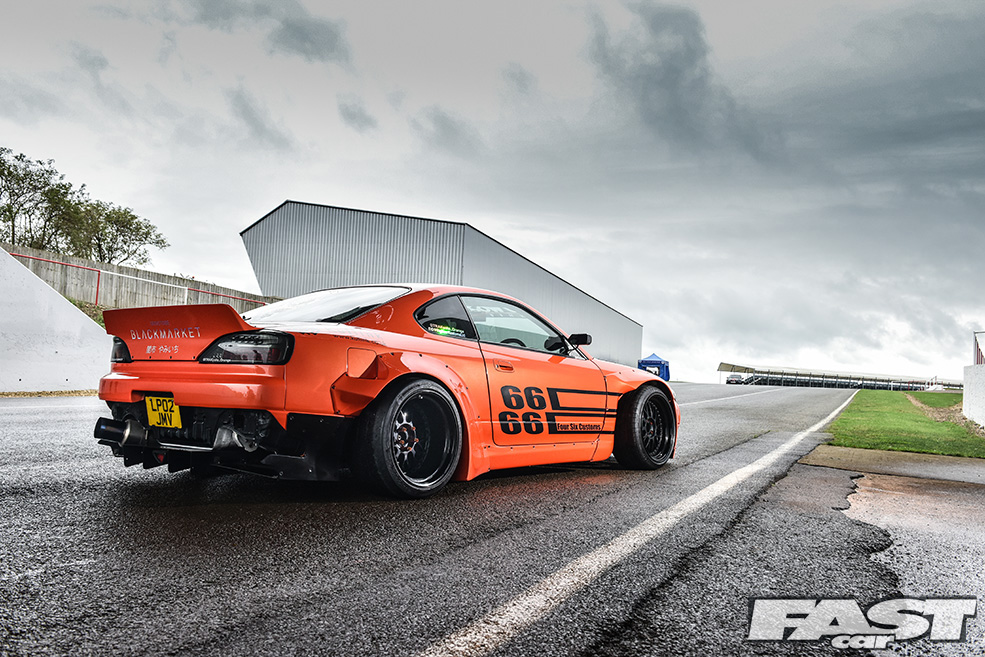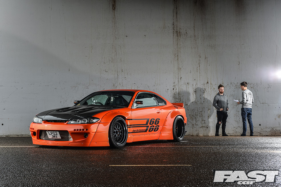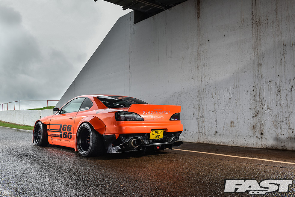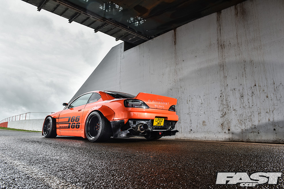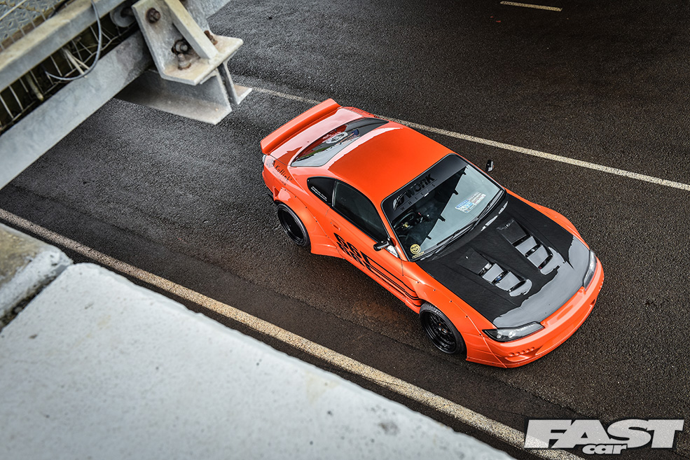 With the help of friend Chris at the local Big Bear Kustoms garage, Elliott was hooked up with this particular S15 Spec-R that was up for sale out in Japan at the time. Already sporting a lairy orange paintjob and that all-important genuine Rocket Bunny wide-body kit, it looked like a great base for Elliott to apply more practical motorsport-inspired touches to over time.