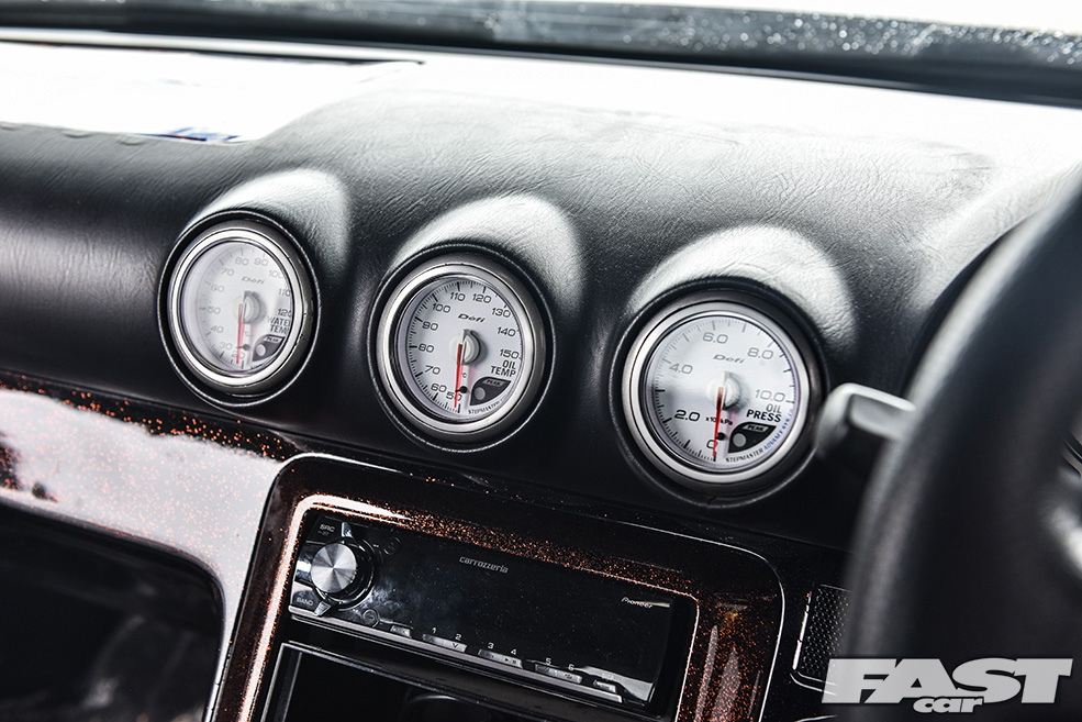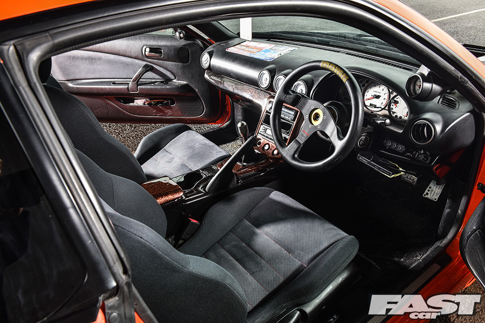 OEM seats; MOMO snap-off leather steering wheel; dash-mounted Defi gauges (water and oil temperature).