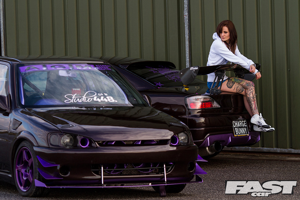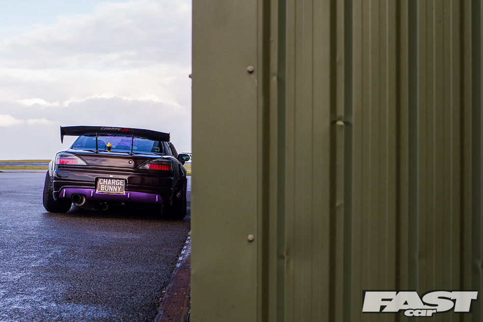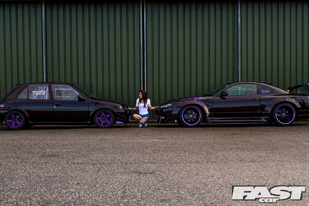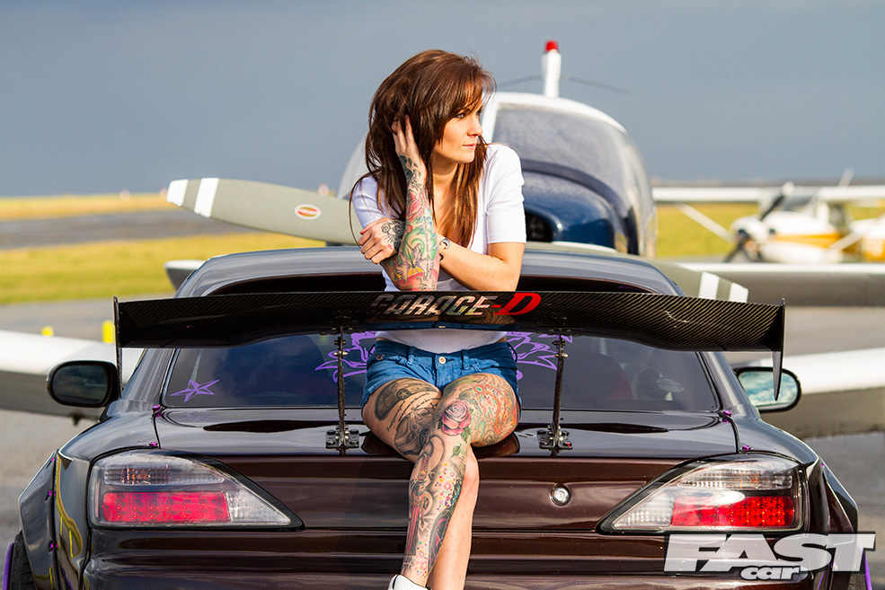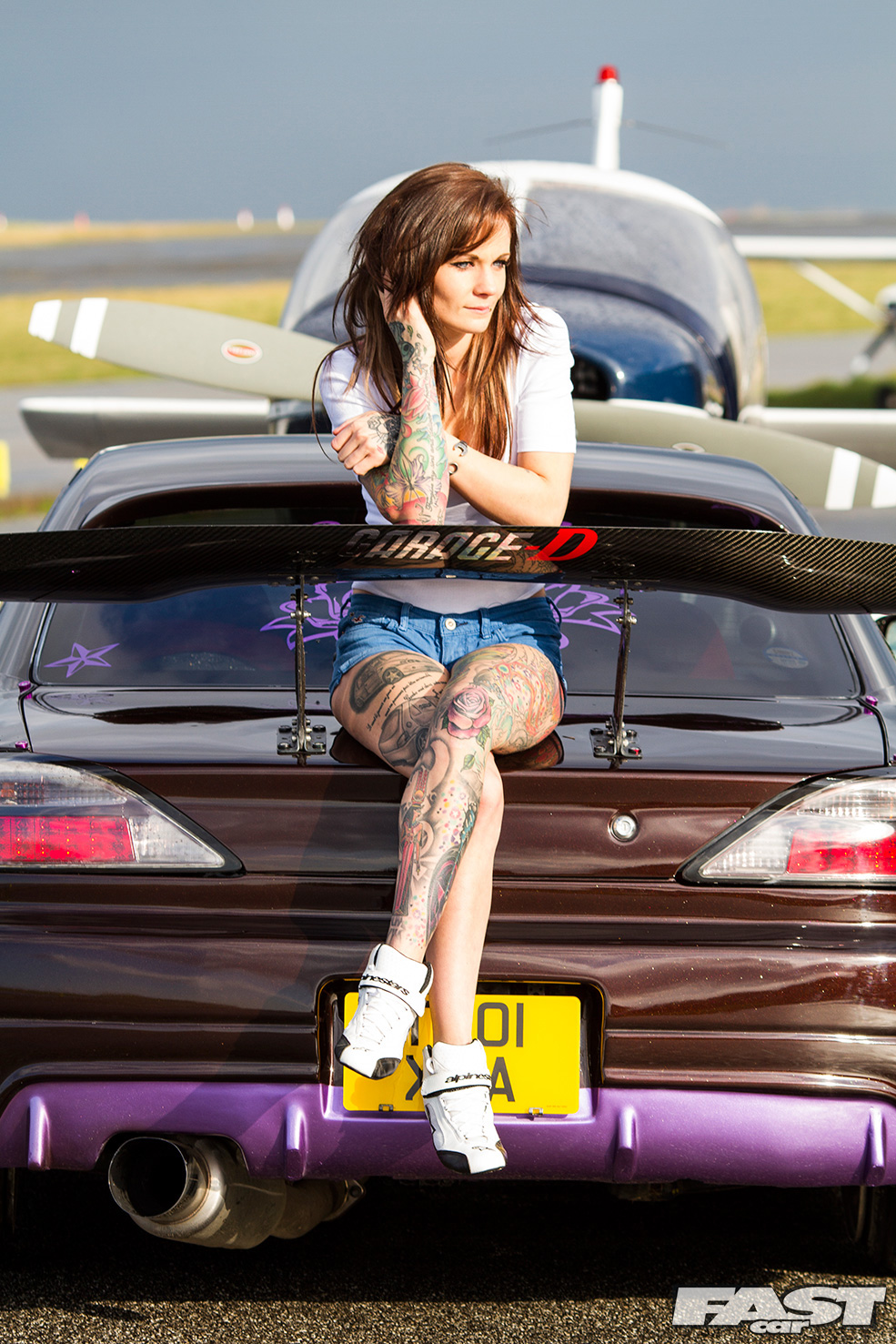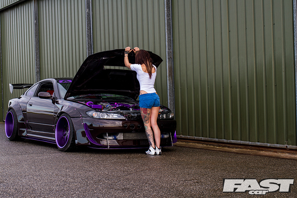 We first met Mel when she told us all about her beloved Maggie, her track-spec 106. She bought the little Peugeot as a complete wreck and transformed it into a mint little motor. She fell so much in love with Maggie that the little 106 even makes up part of Mel’s amazing body art. Now that’s dedication! However, we aren’t here for the Pug. Instead we’re here to check out that dirty wide Nissan S15 she has parked up on her drive.