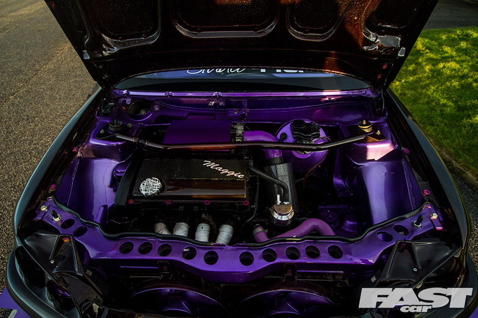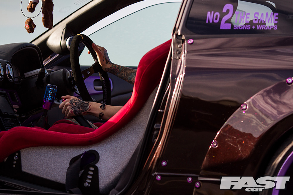 Of course, Mel’s history has taught us that none of her adopted babies stay standard for long, and the S15’s fate was destined to be the same. The Rocket Bunny kit that the car now wears was originally intended for an S13 model, but has been painstakingly grafted onto the Silvia’s bodywork. The end result makes the back end of this drift monster a massive 6ft wide.