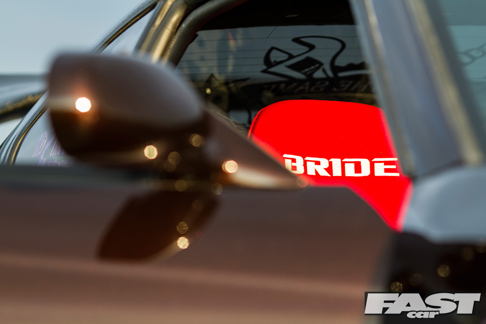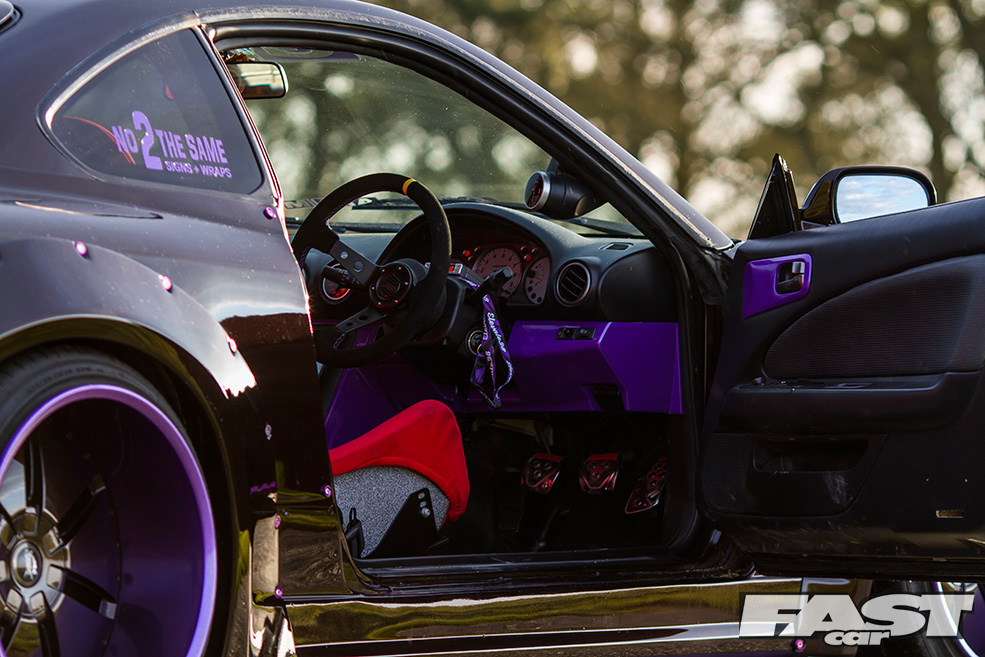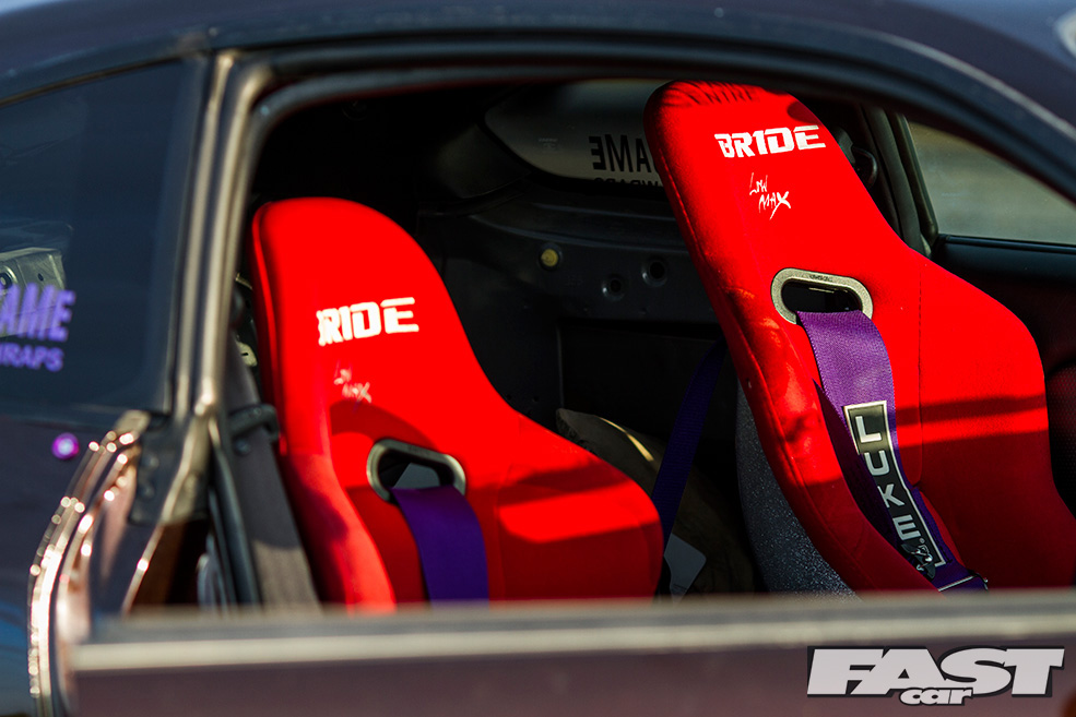 BRIDE Low Max bucket seats; Luke purple harnesses; Defi gauges; Kode purple stitched deep dish steering wheel; Pioneer doubleDIN DVD headunit; purple wrapped dash; stripped rear.