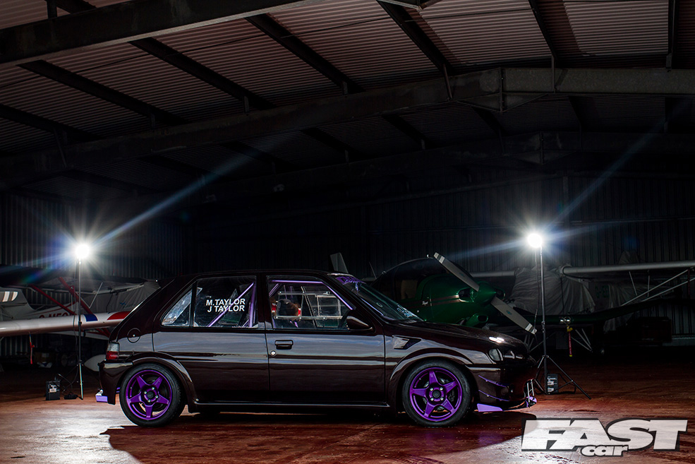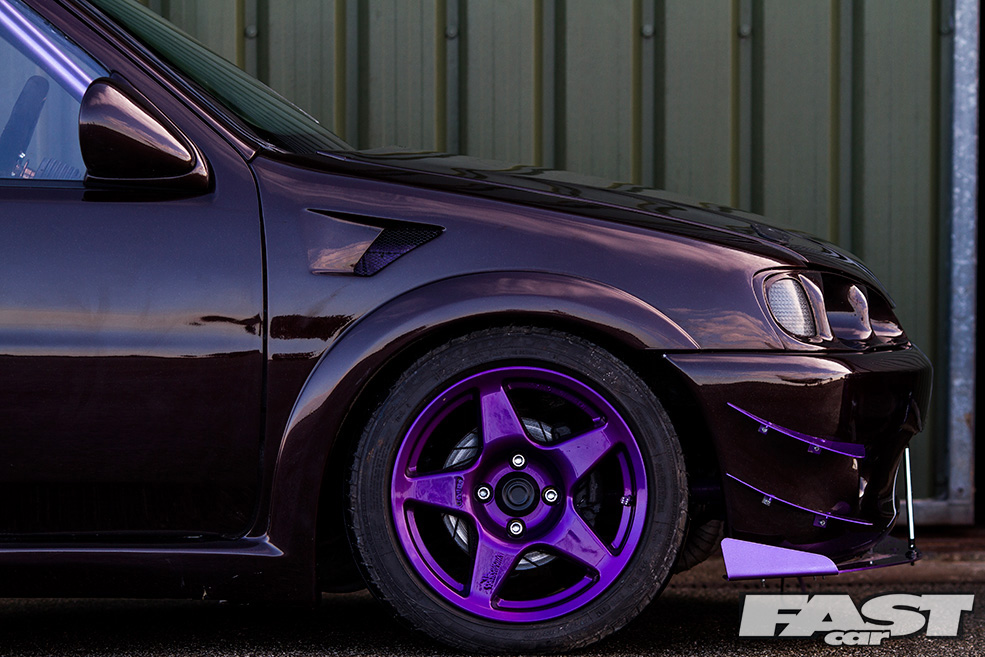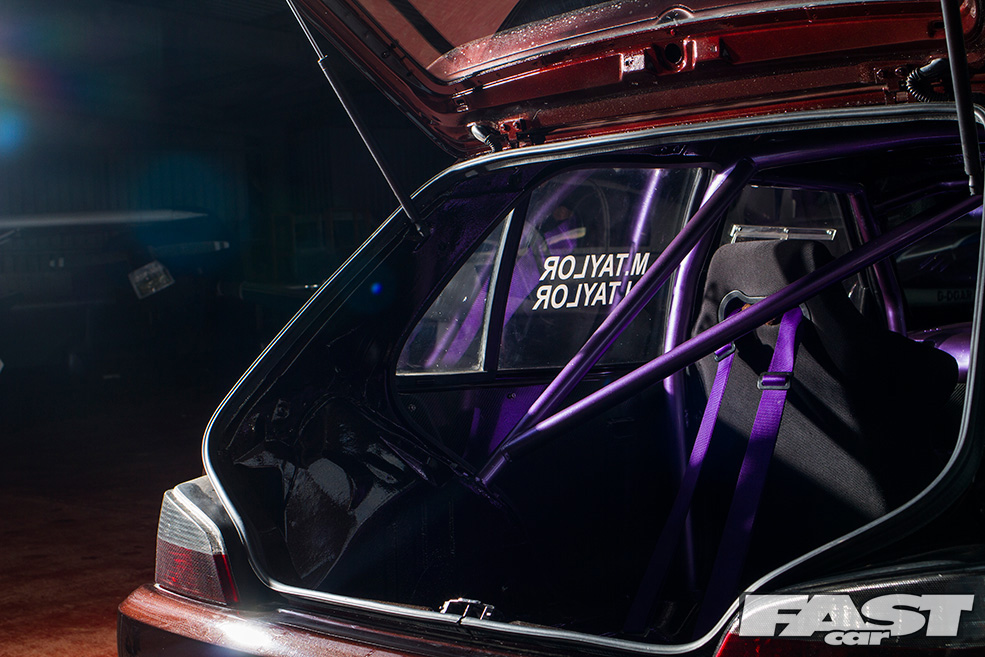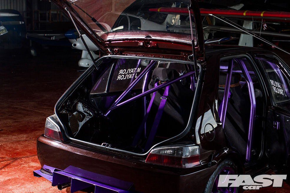 The interior needed to be fit for a princess and it certainly lives up to expectations. The standard seats have been replaced with bright red BRIDE low max buckets and combined with purple LUKE harnesses, perfect to plant her royal bottom on.