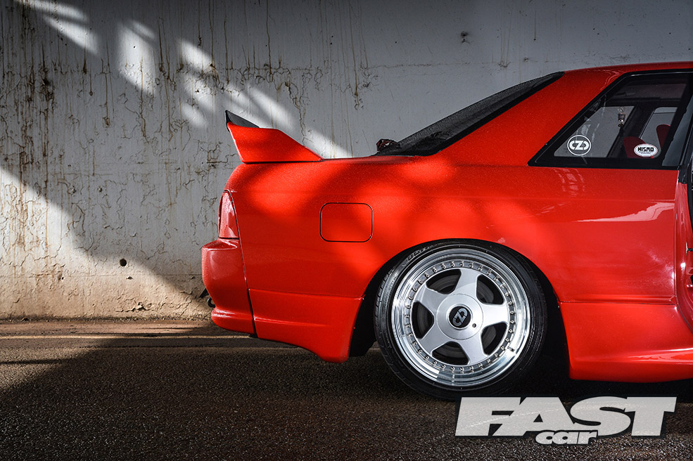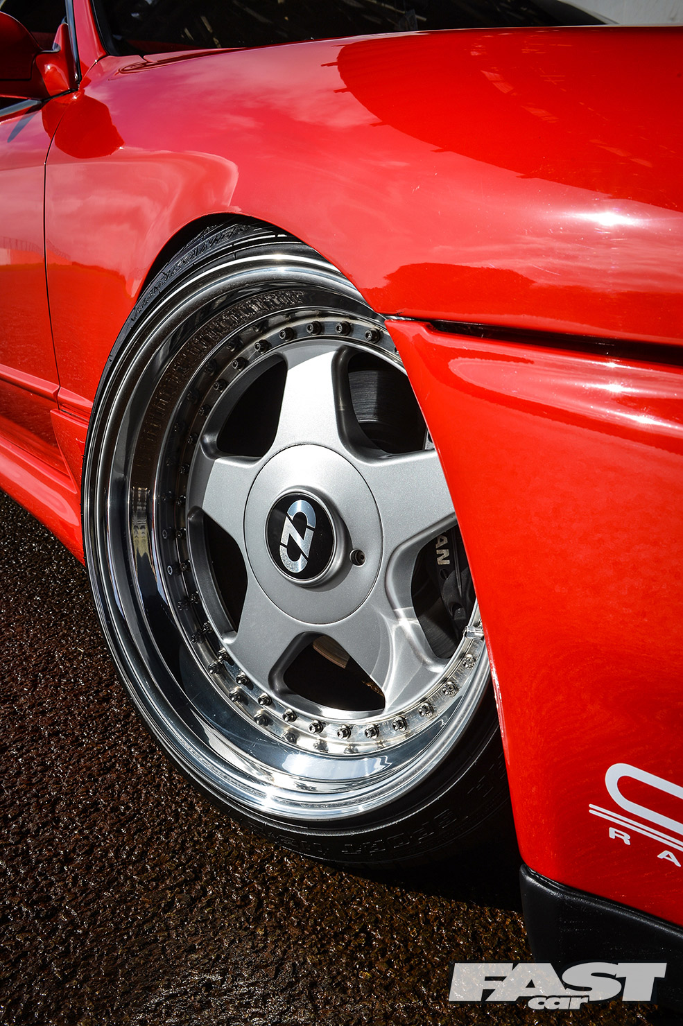 And you know what happens at shows? You get wheel ideas. So, the next job was to change up what was going on under the arches. Rich sourced a set of OZ Futura split-rims, which were a proper Nissan fitment but, at ET24 and 9×17 inches, a little too narrow for his liking. To sort this out, he sourced some 3-inch lips from Germany and rebuilt them himself with the help of his old man, widening to 10 inches and ET12. Much more like it.