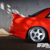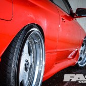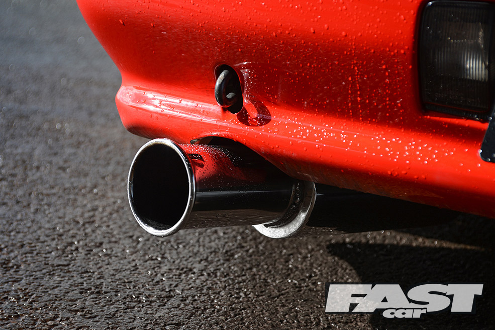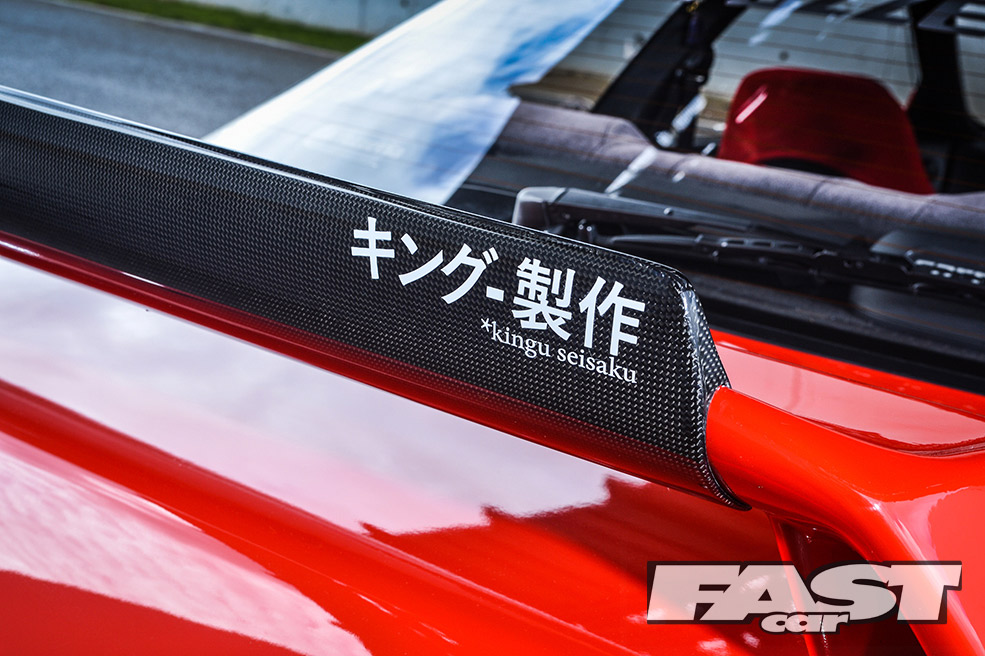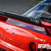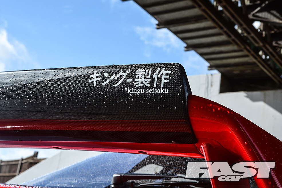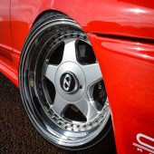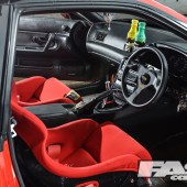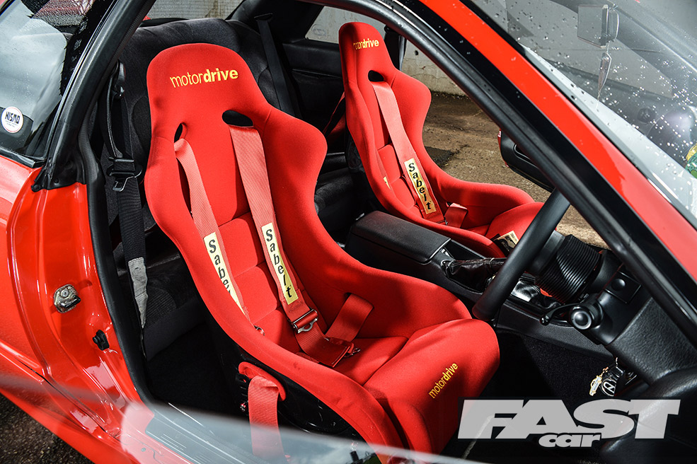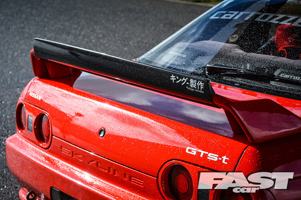 Mazda True red; genuine GT-R aluminium bonnet, grille, bumper, splitter and boot spoiler; Fujimura Rocket Dancer carbon-fibre rear spoiler aero flap; GTS-T Type M sideskirts and rear spats; pulled and reshaped rear arches; front wings reshaped for clearance.