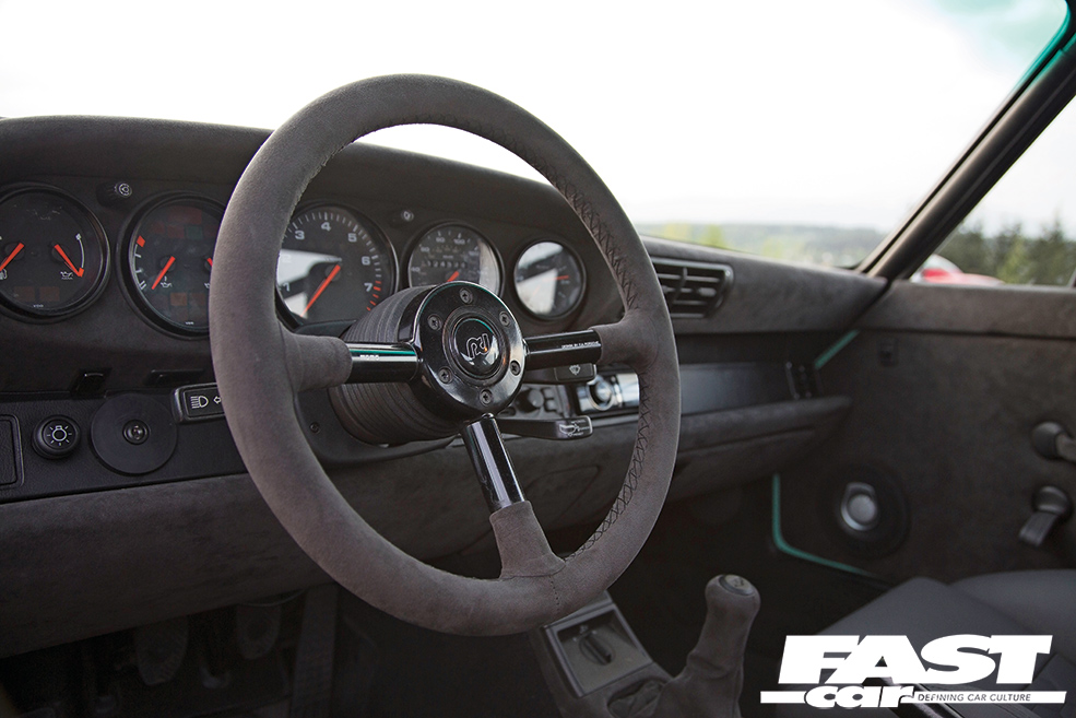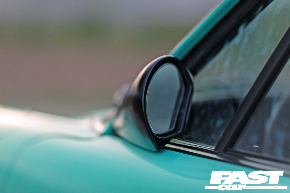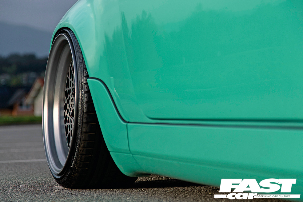 964 RS dummy foglights, AP Car Design clear bumper lights, StyleHaus shaved front license plate recess, StyleHaus shaved tow hook front & rear, StyleHaus shaved mirrors, StyleHaus full respray in Porsche Peppermint Green, StyleHaus rolled/pulled/smoothed fenders (arches), AP Car Design carbon cup mirror (driver’s side only), 964 RS clear rear windscreen