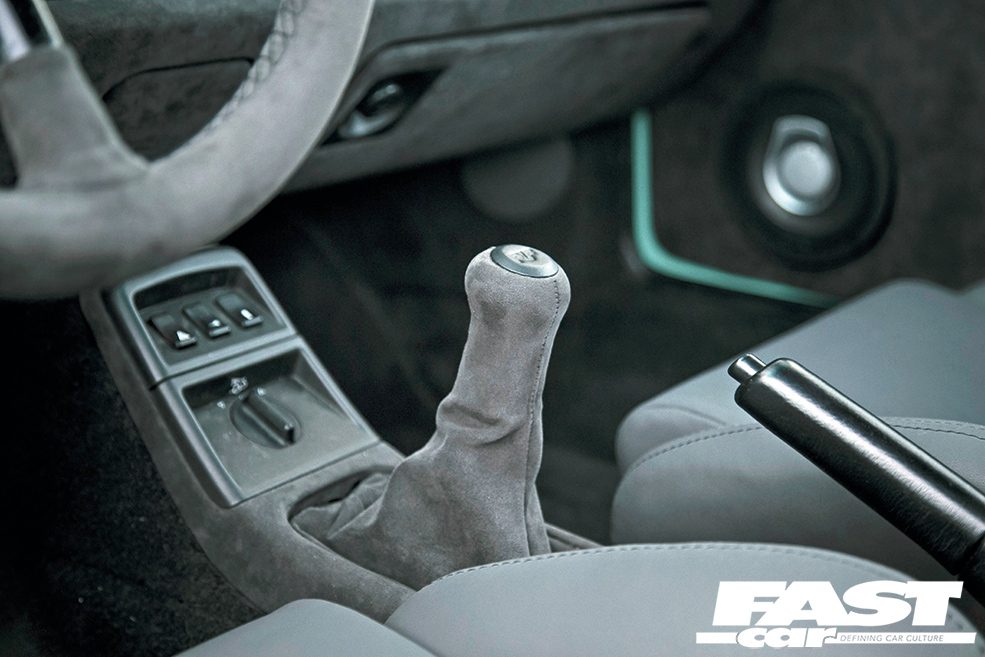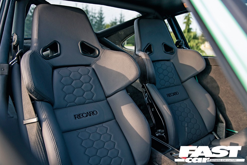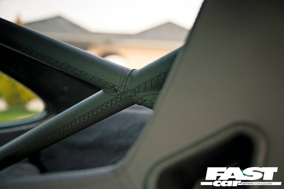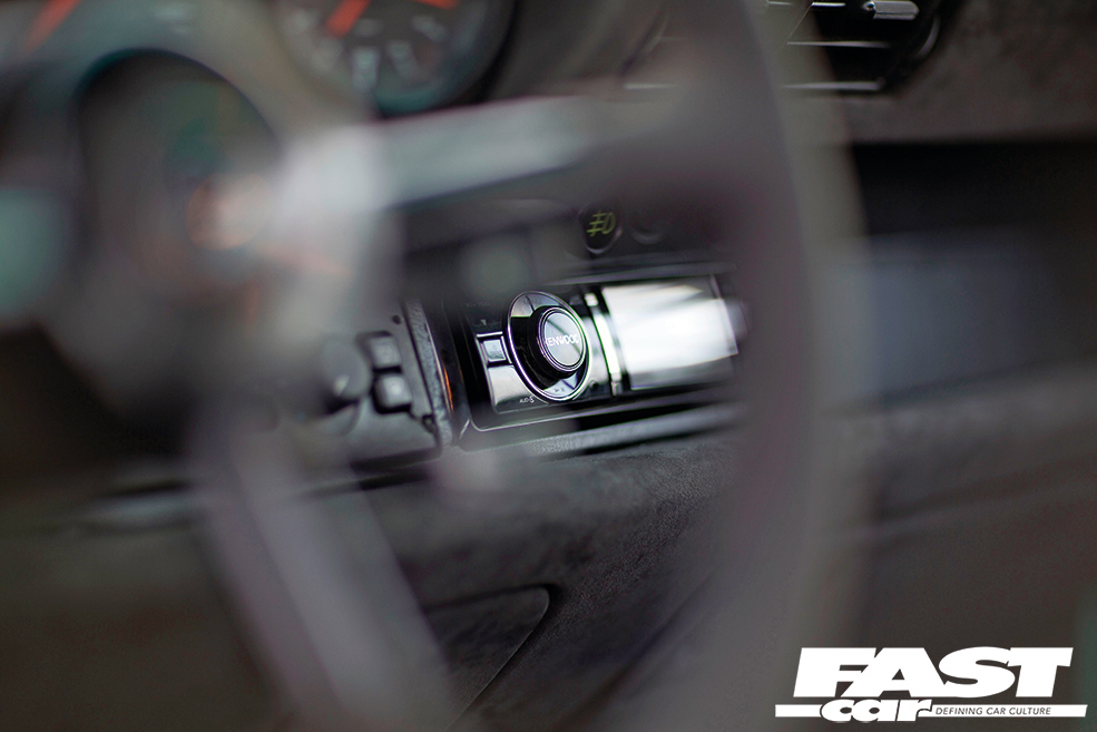 AP Car Design 1/2 cage – leather-wrapped and stitched by Plush Automotive, Recaro A8s re-trimmed by Plush Automotive – leather fronts and Alcantara backs, RUF shift knob re-trimmed by Plush, Momo X Porsche Design steering wheel & hub re-trimmed by Plush, 964 RS door panels re-trimmed by Plush, 964 RS rear carpet kit, Dash, centre console, etc. trimmed by Plush, Kenwood headunit & speakers