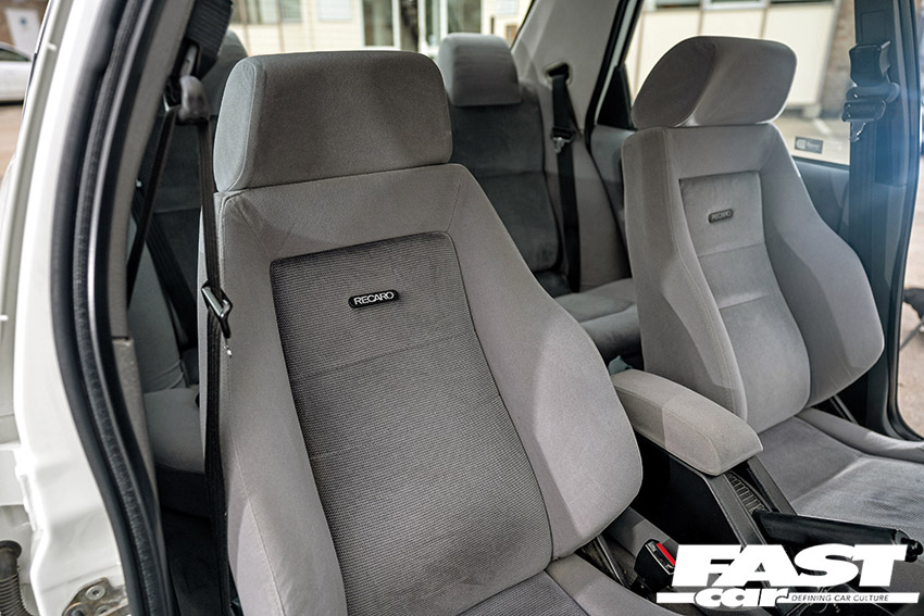 Original 2WD cloth Recaro interior, OMP suede steering wheel, gauges mounted on A pillar: boost and oil pressure