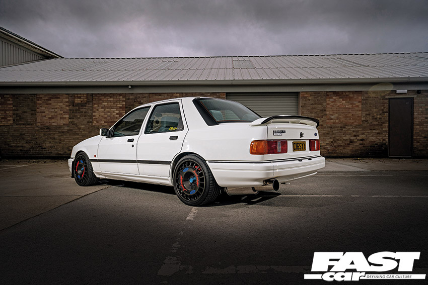 Perhaps the most striking part of this tuned Sapphire RS Cosworth is the wheels, as Christian agrees: “I saw a set of Rotas in gloss black on a white 4×4 and really liked them.” They’re certainly different from the Comps he previously ran, but the 8.5J width meant he had to roll the arches and cut away the wing brackets for clearance.