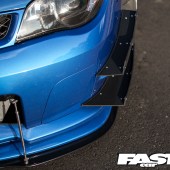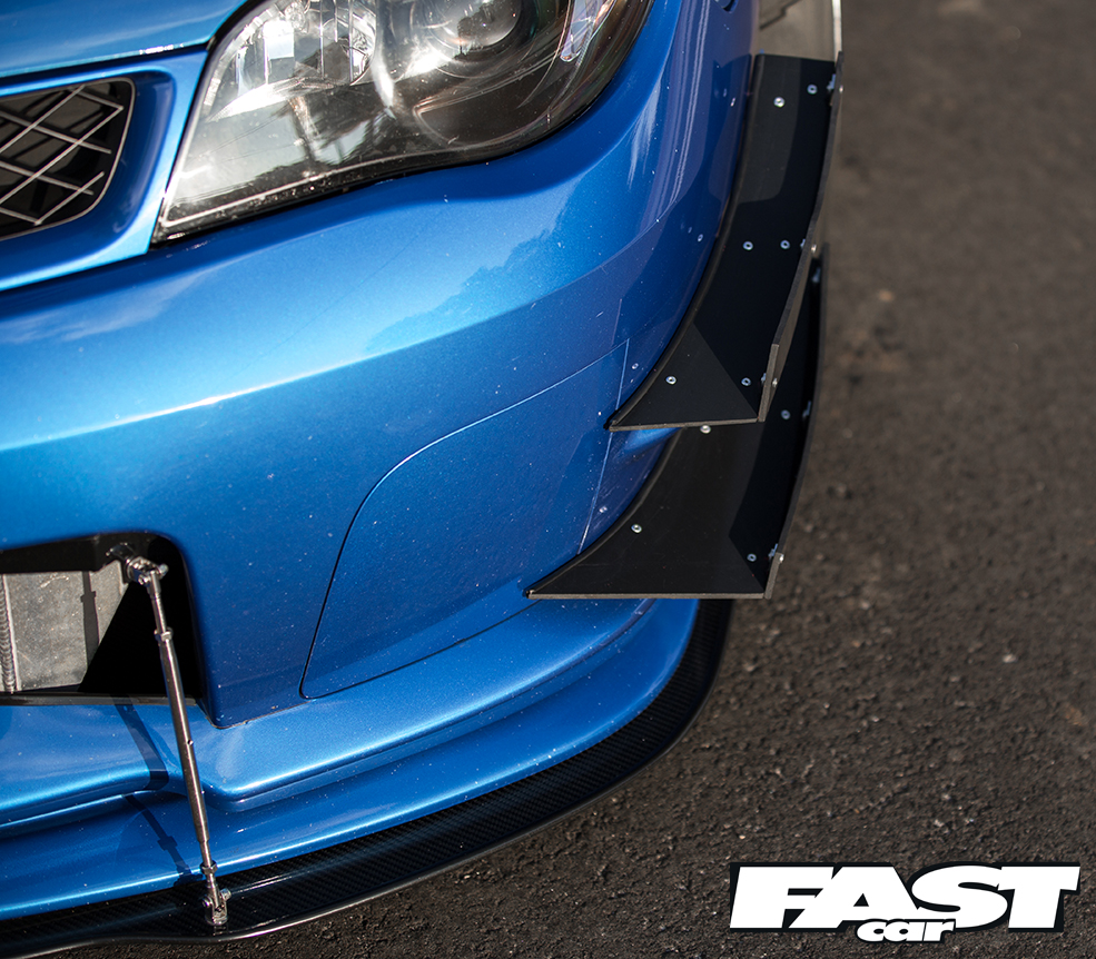 Sedan front end conversion, Karlton fender flares, HTautos side skirt extensions, carbon canards, Mature rear diffuser, RS scoop-less bonnet, shaved roof, STi front lip, APR splitter, Morimoto 55W HID kit.