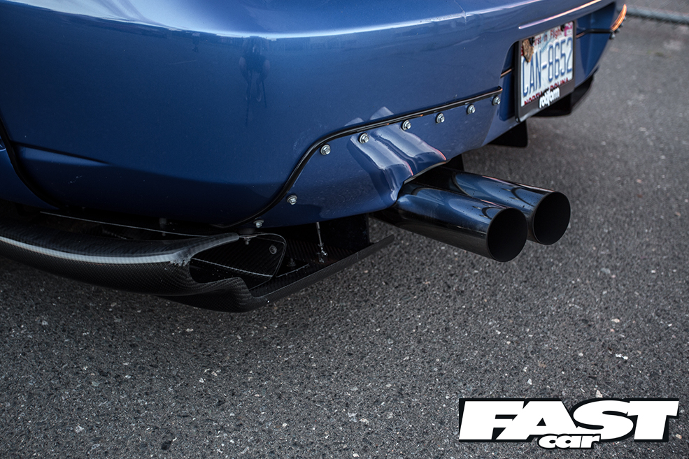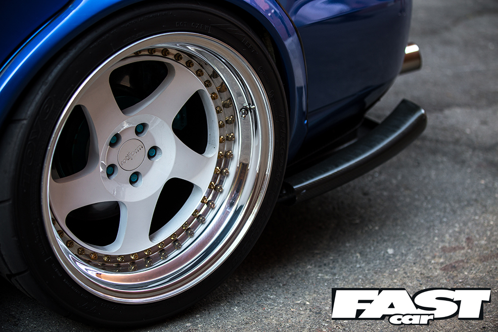 Take the reassuringly fat tyres. There’s not a sniff of the stretching we’ve become accustomed to on such aggressively stanced animals. As if those 11.5-inch wide Rotiform TMBs aren’t crazy enough, Andrew has chosen to wrap ’em in whopping 295/30 Toyo 888R rubber straight from the track. He’s done it the old fashioned way. No wonder he needs those Karlton fender flares to keep them under the arches!