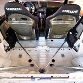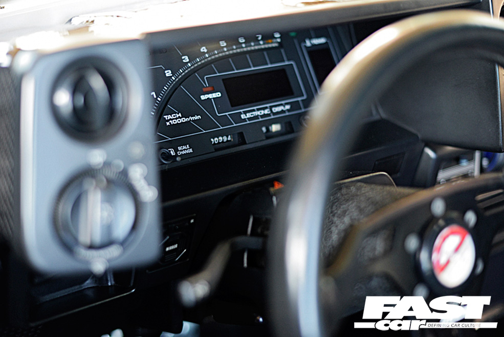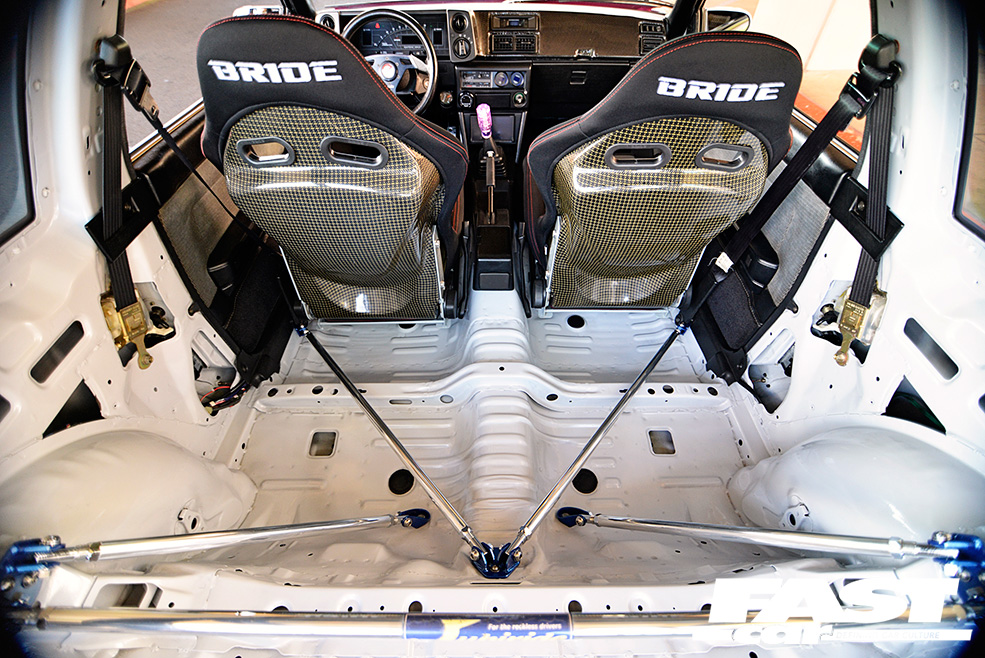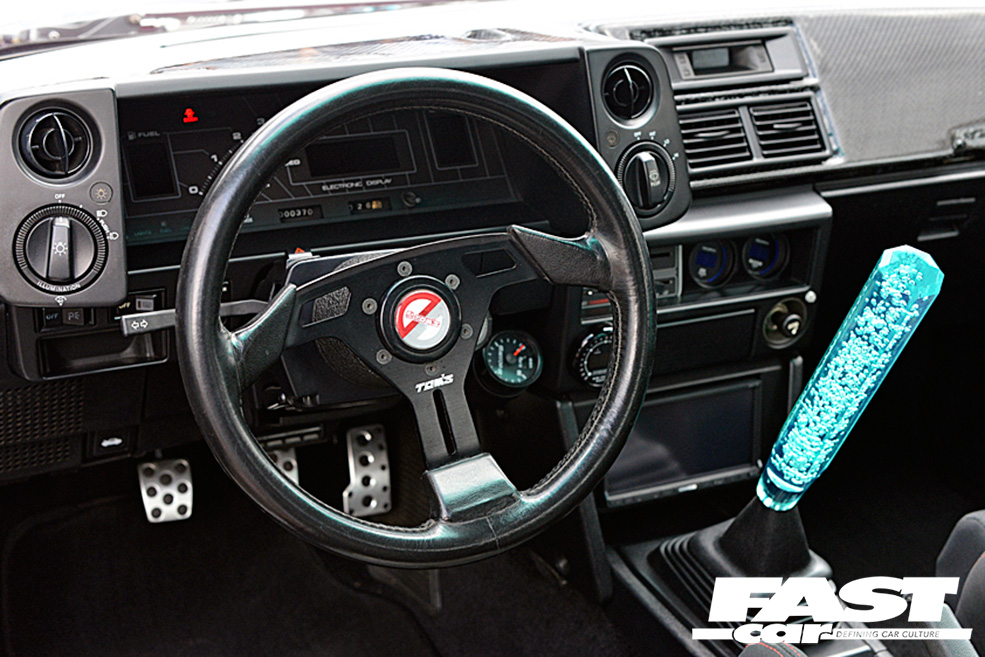 Bride Low Max carbon/kevlar front seats, rear seats removed, TOM’S 330mm steering wheel, JDM dildo shift knob, JDM AE86 digital gauge cluster, custom carbon fibre dashboard.