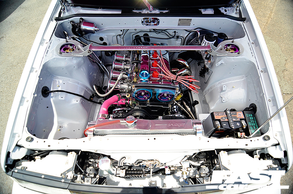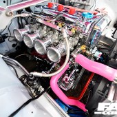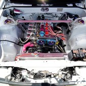 Toyota 4A-GE block, 11:1 compression ratio, Razorback SV21 ECU, HKS 272 cams, Ferrea valves, TRD valve springs, Cometic head gasket, TRD timing belt, Wiseco pistons, NonStop Tuning pulleys, TRD engine mounts, T3 Funnels air intake, AE101 20V 43mm individual throttle bodies, Walbro 255 fuel pump, Sard fuel pressure regulator, Honda fuel injectors, Silk Road manifold, Run Free exhaust system, NGK spark plugs, TRD spark plug wires, Braille battery, Koyo radiator with Mishimoto dual electric fans, Samco hoses, engine bay wire tucked & ancillary parts chromed, Toyota T50 TRD gearbox, Cusco LSD, Superior clutch, HKS 12lb flywheel .