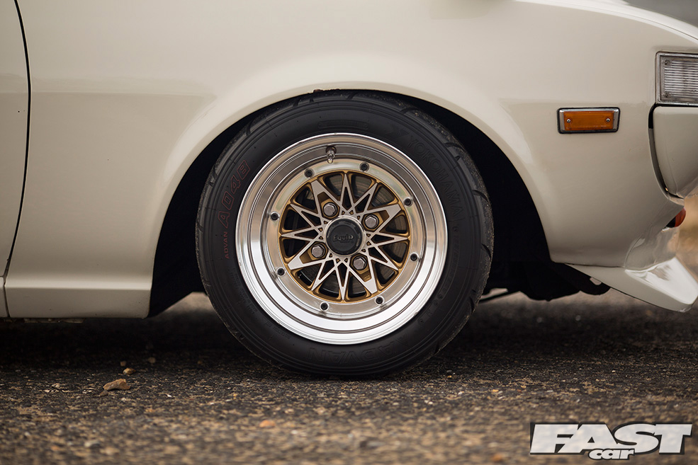 7.5x14in Work Equip Spirit 11 (front) and 8.5x14in Riverside R109 with Pine Engineering lips (rear); RAYS Engineering nuts; 185/55 (f) and 195/60 (r) Yokohama Advan A048 semi-slicks; Driftworks CS2 AE86 coilovers; AE86 front brakes.