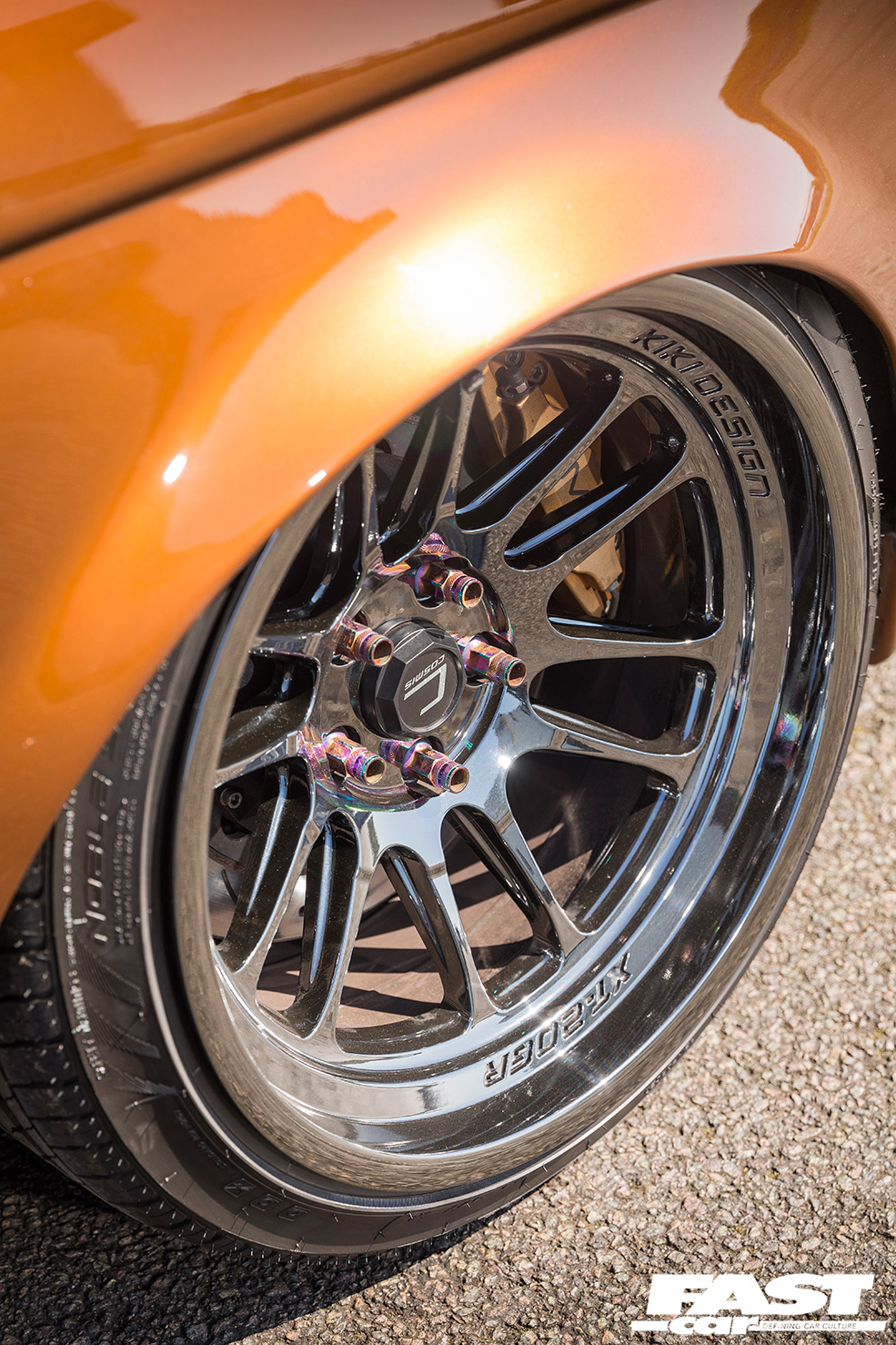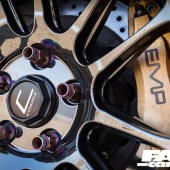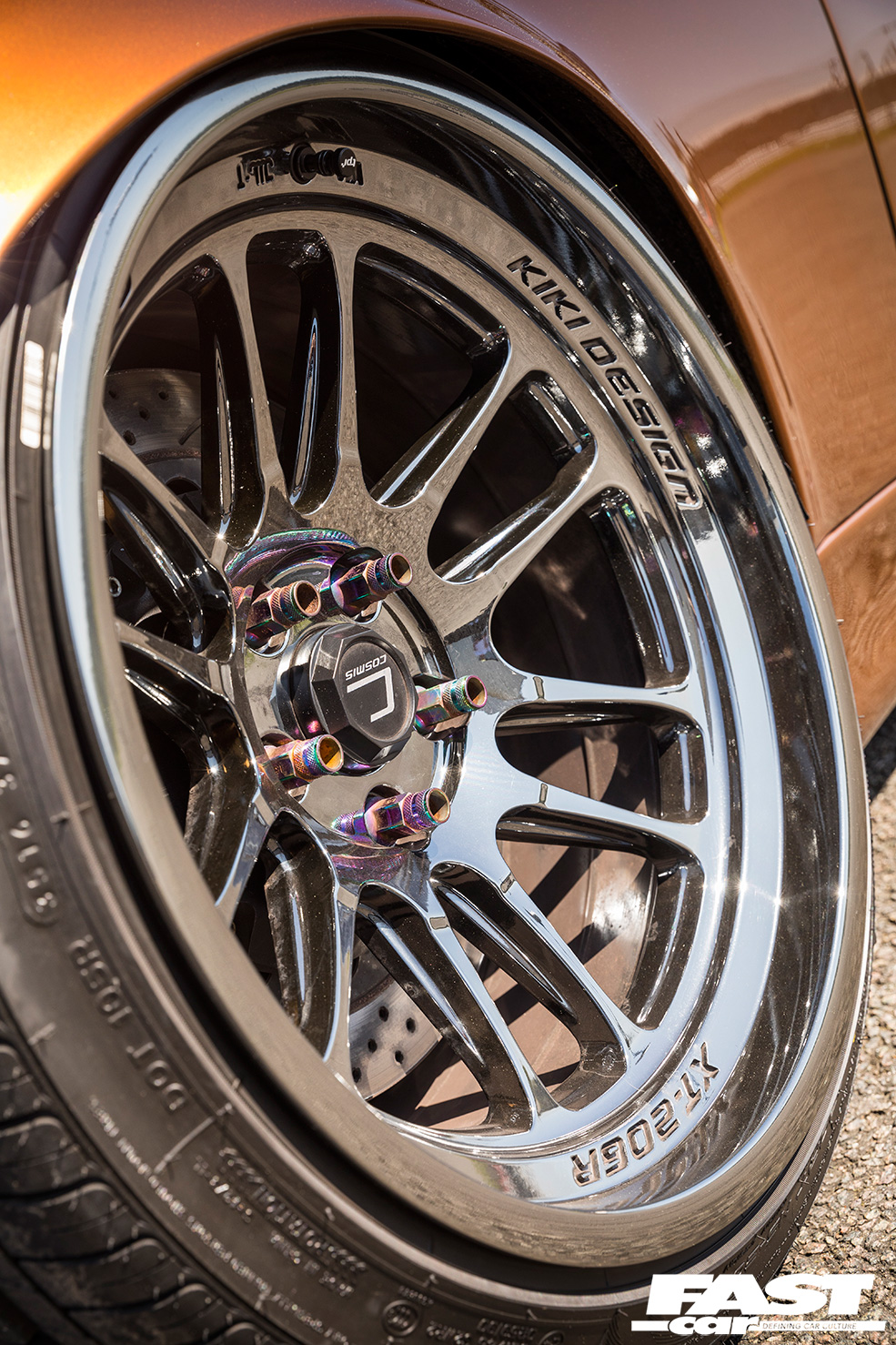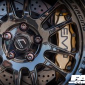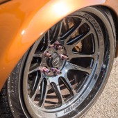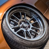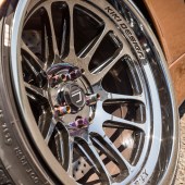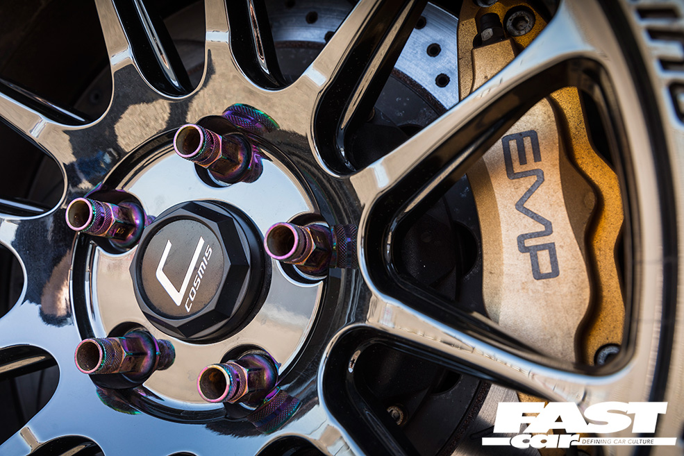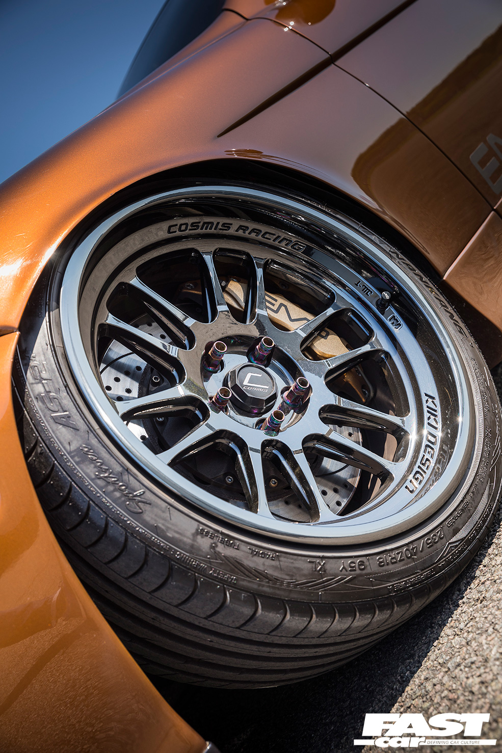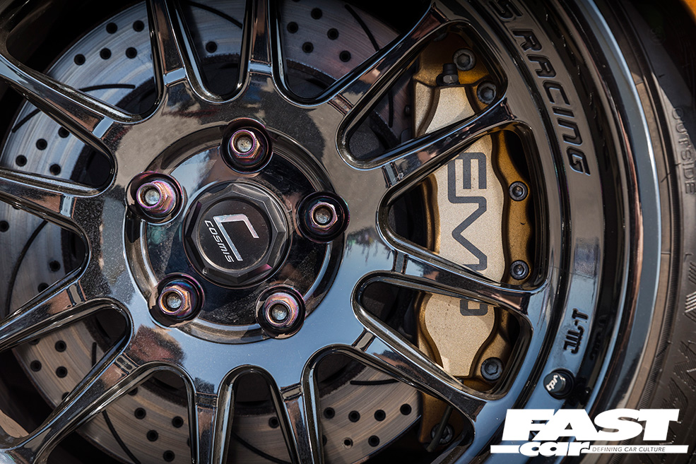 9.5x18in (front) and 11x18in (rear) Cosmis Racing alloy wheels finished in Shadow Chrome; 235/40/18 (front) and 265/35/18 (rear) Nankang NS-2R tyres; D2 Performance air suspension struts with Air Lift Performance V2 management; PB Brakes 8-pot (front) and 6-pot (rear) disc brake setup with 356mm discs (all-round).